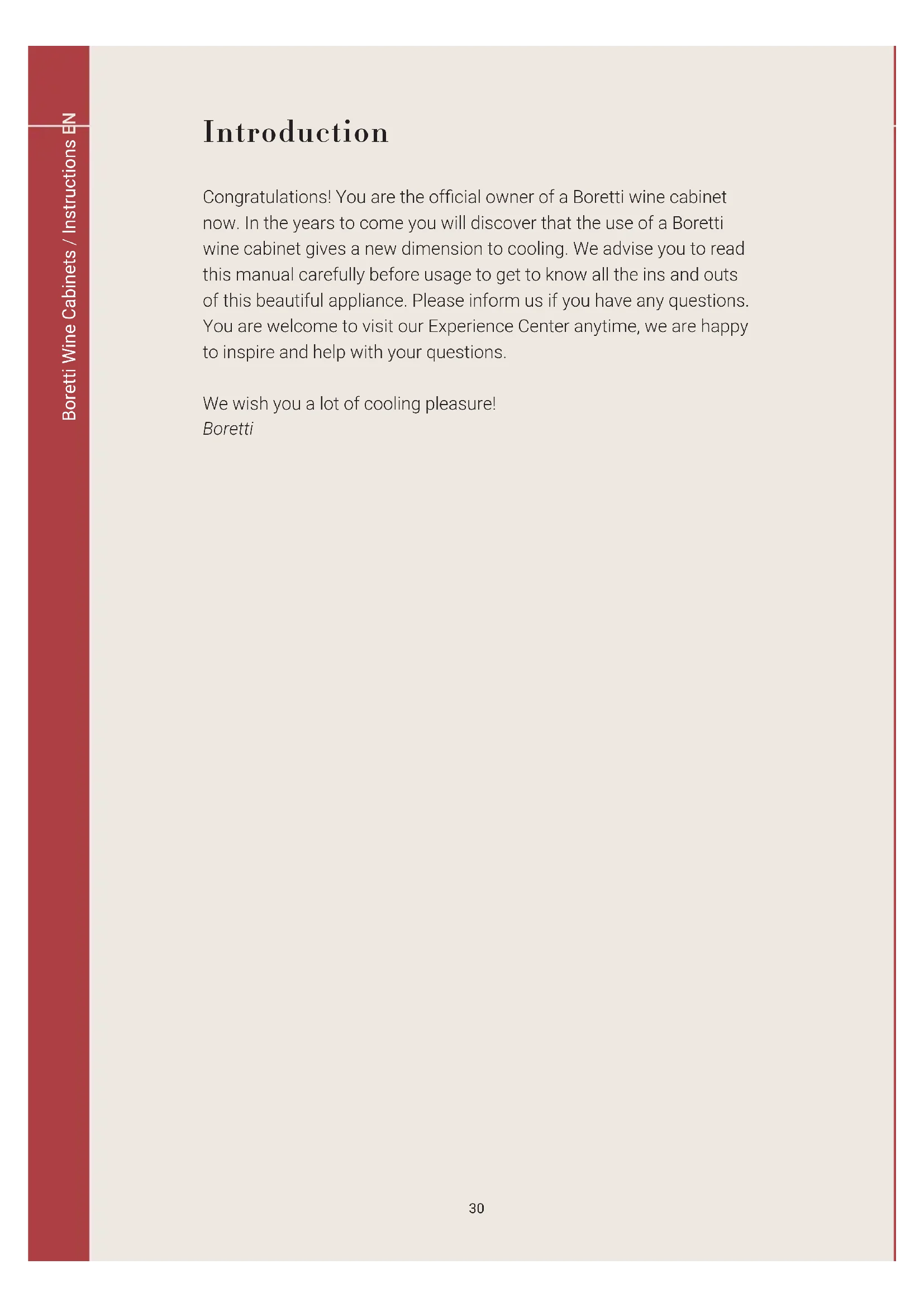 Introduction Boretti Wine Cabinets / Instructions EN31 Introduction 30 Before use 32 Important safety instructions 33 Installation of the wine cabinet 34 Usage of the wine cabinet