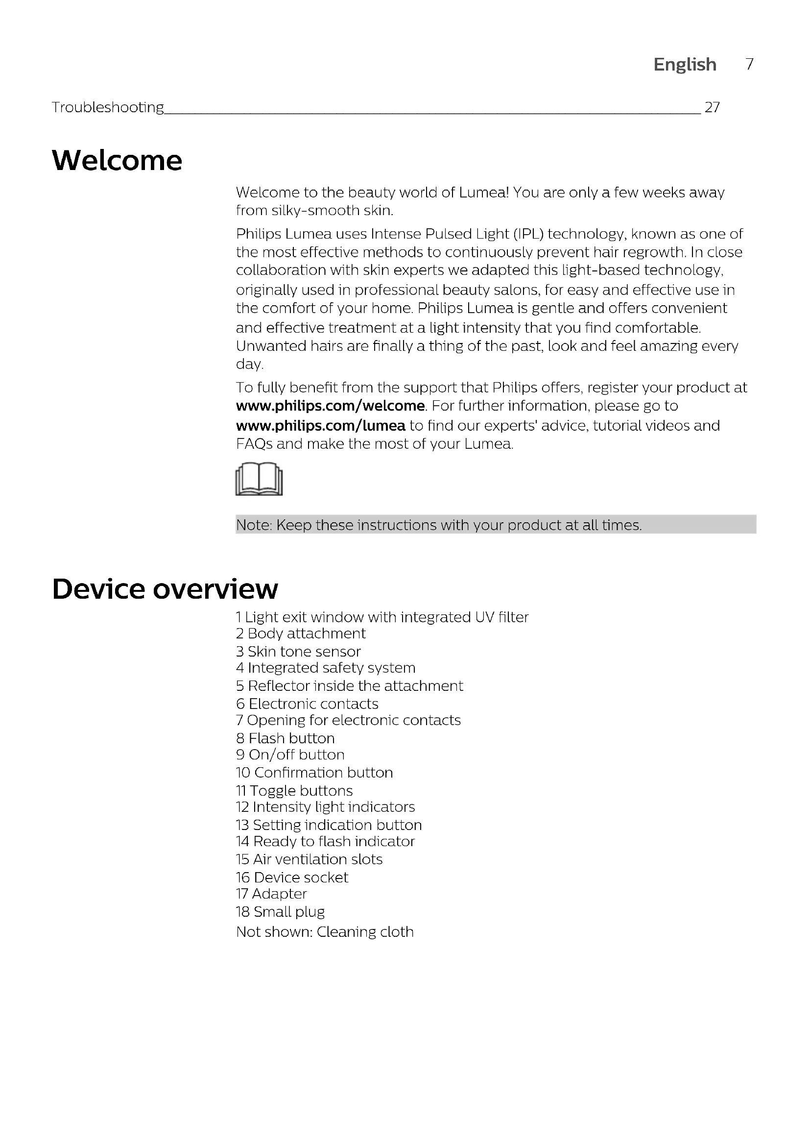 EnglishTroubleshooting_______________________________________________________________________________________ 27 Welcome Welcome to the beauty world of Lumea! You are only a few weeks away from silky-smooth skin. Philips Lumea uses Intense Pulsed Light (IPL) technology, known as one of the most effective methods to continuously prevent hair regrowth. In close collaboration with skin experts we adapted this light-based technology, originally used in professional beauty salons, for easy and effective use in the comfort of your home. Philips Lumea is gentle and offers convenient and effective treatment at a light intensity that you find comfortable. Unwanted hairs are finally a thing of the past, look and feel amazing every day. To fully benefit from the support that Philips offers, register your product at www.philips.com/welcome. For further information, please go to www.philips.com/lumea to find our experts' advice, tutorial videos and FAQs and make the most of your Lumea. Note: Keep these instructions with your product at all times. Device overview 1 Light exit window with integrated UV filter 2 Body attachment 3 Skin tone sensor 4 Integrated safety system 5 Reflector inside the attachment 6 Electronic contacts 7 Opening for electronic contacts 8 Flash button 9 On/off button 10 Confirmation button 11 Toggle buttons 12 Intensity light indicators 13 Setting indication button 14 Ready to flash indicator 15 Air ventilation slots 16 Device socket 17 Adapter 18 Small plug Not shown: Cleaning cloth
