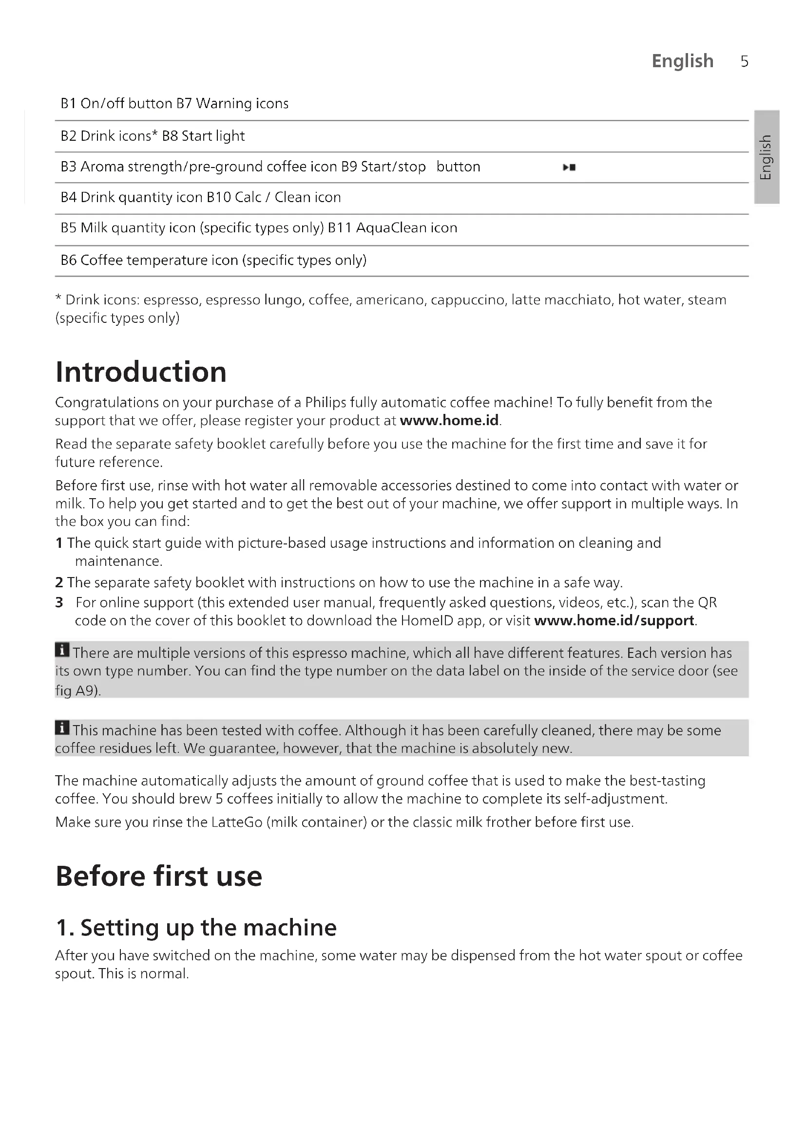 - Drink icons: espresso, espresso lungo, coffee, americano, cappuccino, latte macchiato, hot water, steam (specific types only) Introduction Congratulations on your purchase of a Philips fully automatic coffee machine! To fully benefit from the support that we offer, please register your product at www.home.id. Read the separate safety booklet carefully before you use the machine for the first time and save it for future reference. Before first use, rinse with hot water all removable accessories destined to come into contact with water or milk. To help you get started and to get the best out of your machine, we offer support in multiple ways. In the box you can find: 1 The quick start guide with picture-based usage instructions and information on cleaning and maintenance. 2 The separate safety booklet with instructions on how to use the machine in a safe way. 3 For online support (this extended user manual, frequently asked questions, videos, etc.), scan the QR code on the cover of this booklet to download the HomeID app, or visit www.home.id/support. There are multiple versions of this espresso machine, which all have different features. Each version has its own type number. You can find the type number on the data label on the inside of the service door (see fig A9). This machine has been tested with coffee. Although it has been carefully cleaned, there may be some coffee residues left. We guarantee, however, that the machine is absolutely new. The machine automatically adjusts the amount of ground coffee that is used to make the best-tasting coffee. You should brew 5 coffees initially to allow the machine to complete its self-adjustment. Make sure you rinse the LatteGo (milk container) or the classic milk frother before first use. Before first use