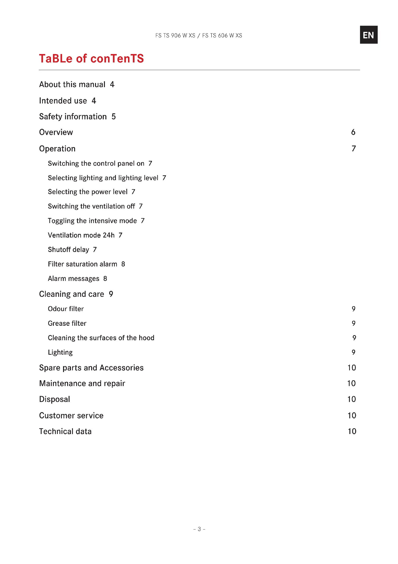 Table of conTenTs About this manual 4 Intended use 4 Safety information 5 Overview 6 Operation 7 Switching the control panel on 7 Selecting lighting and lighting level 7 Selecting the power level 7 Switching the ventilation off 7 Toggling the intensive mode 7 Ventilation mode 24h 7 Shutoff delay 7 Filter saturation alarm 8 Alarm messages 8 Cleaning and care 9 Odour filter 9 Grease filter 9 Cleaning the surfaces of the hood 9 Lighting 9 Spare parts and Accessories 10 Maintenance and repair 10 Disposal 10 Customer service 10 Technical data 10FS TS 906 W XS / FS TS 606 W XS – 4 –