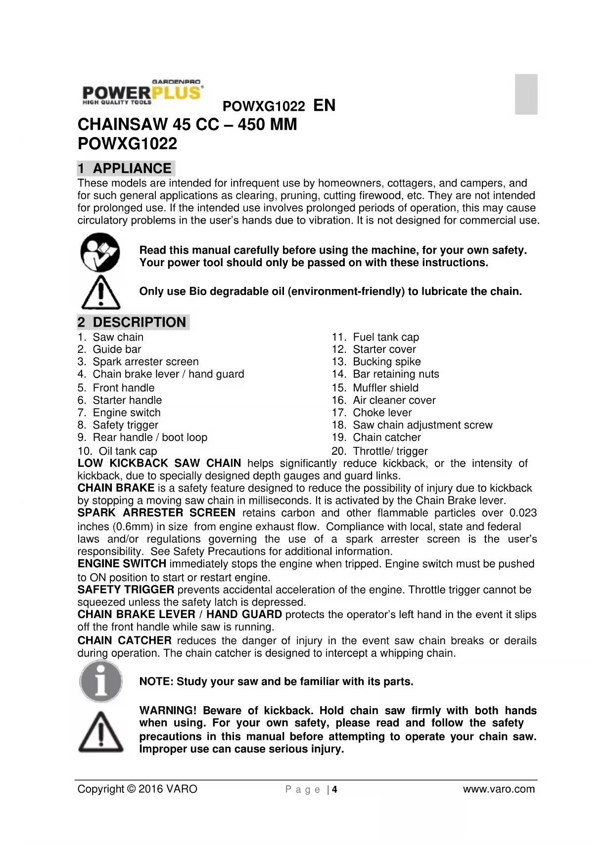 Denotes risk of personal injury or damage to the tool. 5 SAFETY DO NOT operate a chain saw with one hand! Serious injury to the operator, helpers, bystanders, or any combination of these persons may result from one-handed operation. A chain saw is intended for two-handed use. DO NOT operate a chain saw when you are fatigued, under the influence of drugs, alcohol or medication.POWXG1022 EN Copyright © 2016 VARO P a g e | 6 www.varo.com Use safety footwear, snug-fitting clothing, protective gloves, and eye, hearing and head protection devices. Use caution when handling fuel. To avoid fire, move the chain saw at least 10 feet (3m) from the fuelling point before starting the engine. DO NOT allow other persons to be near when starting or cutting with the chain saw. Keep bystanders and animals out of the work area. DO NOT start cutting until you have a clear work area, secure footing, and a planned retreat path from the falling tree. Keep all parts of your body away from the saw chain when the engine is running. Before you start the engine, make sure that the saw chain is not contacting anything. Carry the chain saw with the engine stopped, the guide bar and saw chain to the rear, and the muffler away from your body. DO NOT operate a chain saw that is damaged, improperly adjusted, or not completely and securely assembled. Be sure that the saw chain stops moving when the throttle control trigger is released. Shut off the engine before setting the chain saw down. Use extreme caution when cutting small size brush and saplings because slender material may catch the saw chain and be whipped toward you or pull you off balance. When cutting a limb that is under tension, be alert for spring back so that you will not be struck when the tension in the wood fibres is released. Keep the handles dry, clean, and free of oil or fuel mixture. Operate the chain saw only in well-ventilated areas. DO NOT operate a chain saw in a tree unless you have been specifically trained to do so. All chain saw service, other than the items listed in the user manual safety and maintenance instructions, should be performed by competent chain saw service personnel. When transporting your chain saw, use the appropriate guide bar scabbard. DO NOT operate your chain saw near or around flammable liquids or gases whether in or out of doors. An explosion and/or fire may result. Do not fill fuel tank, oil tank or lubricate when the engine is running. USE THE RIGHT TOOL: Cut wood only. Do not use the chain saw for purposes for which it was not intended. For example, do not use the chain saw for cutting plastic, masonry, or non-building materials. The first time user should have practical instruction in the use of chainsaw and the protective equipment from an experienced operator. Do not attempt to hold the saw with one hand only. You cannot control reactive forces and you may lose control of the saw, which can result in the skating or bouncing of the bar and chain along the limb or log. Never run the chainsaw indoors. Your chainsaw produces poisonous exhaust as soon as the combustible engine is started, which may be colourless and odourless. To use this product can generate dust, mists and fumes containing chemicals known to cause reproductive harm. Be aware of harmful dust, mist (such as saw dust or oil mist from chain lubrication) and protect yourself properly. Wear gloves and keep your hand warm. Prolonged use of chainsaws exposing the operator to vibrations may produce whitefinger disease. In order to reduce the risk of whitefinger disease, please wear gloves and keep your hand warm. If any of the whitefinger symptoms appear, seek medical advice immediately. Drive in the spiked bumper of the chainsaw directly behind the intended hinge and pivot the saw around this point. The spiked bumper rolls against the trunk. Only chain, guide bar and spark plug can be replaced by the user himself. Always make sure you replace with correct material as stated in the specifications of the manual.POWXG1022 EN Copyright © 2016 VARO P a g e | 7 www.varo.com