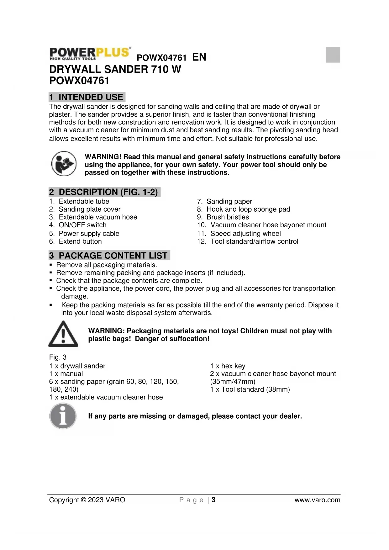 plastic bags! Danger of suffocation! Fig. 3 1 x drywall sander 1 x manual 6 x sanding paper (grain 60, 80, 120, 150, 180, 240) 1 x extendable vacuum cleaner hose 1 x hex key 2 x vacuum cleaner hose bayonet mount (35mm/47mm) 1 x Tool standard (38mm) If any parts are missing or damaged, please contact your dealer.POWX04761 EN Copyright © 2023 VARO P a g e | 4 www.varo.com 4 SYMBOLS In this manual and/or on the machine the following symbols are used: