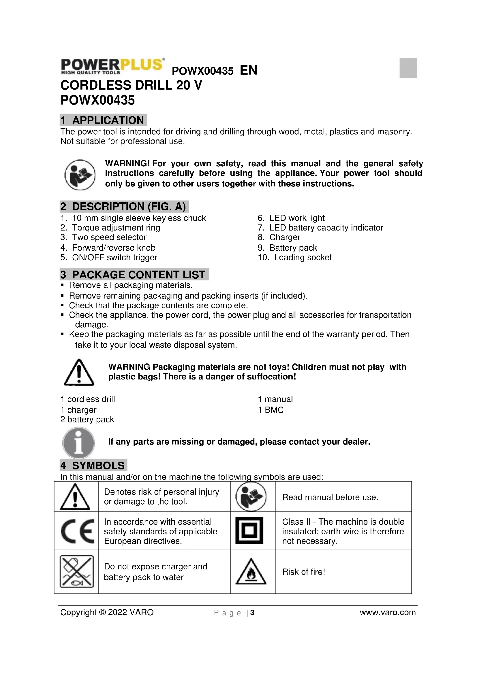 VARO N.V. Vic. Van Rompuy N.V - Joseph Van Instraat 9 - BE2500 Lier - BELGIUM, declares that, Product: Drill – Battery operated trade mark: POWERplus model : POWX00435 is in conformity with the essential requirements and other relevant provisions of the applicable European Directives, based on the application of European harmonized standards. Any unauthorized modification of the apparatus voids this declaration. European Directives (including, if applicable, their amendments up to the date of signature); 2011/65/EU 2006/42/EC 2014/30/EU European harmonized standards (including, if applicable, their amendments up to the date of signature); EN62841-1 : 2015 EN62841-2-1 : 2018 EN55014-1:2017 EN55014-2 : 2015 Keeper of the Technical Documentation : Philippe Vankerkhove, VARO – Vic. Van Rompuy N.V. The undersigned acts on behalf of the company CEO, Ludo Mertens Regulatory Affairs – Compliance Manager 07/01/2022, Lier - BelgiumPOWX00435 DE Copyright © 2022 VARO S e i t e | 1 www.varo.com 1 EINSATZBEREICH ......................................................................... 3