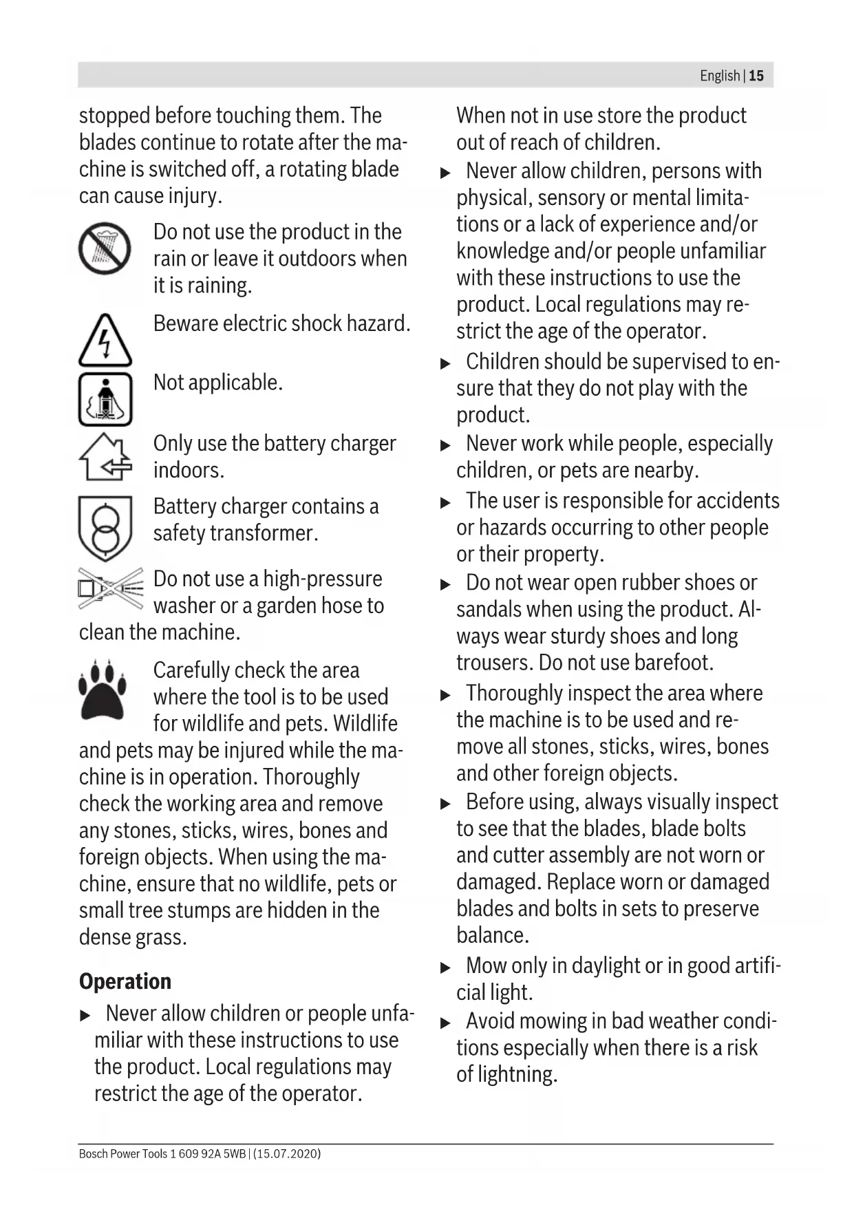 to the product when operat- ing. Caution: Do not touch rotat- ing blades. Sharp blade(s). Beware of severing toes or fingers. Switch off and remove isol- ator switch before adjusting, cleaning and before leaving the product unattended for any period. Not applicable. Wait until all machine com- ponents have completely 1 609 92A 5WB | (15.07.2020) Bosch Power ToolsEnglish | 15 stopped before touching them. The blades continue to rotate after the ma- chine is switched off, a rotating blade can cause injury. Do not use the product in the rain or leave it outdoors when it is raining. Beware electric shock hazard. Not applicable. Only use the battery charger indoors. Battery charger contains a safety transformer. Do not use a high-pressure washer or a garden hose to clean the machine. Carefully check the area where the tool is to be used for wildlife and pets. Wildlife and pets may be injured while the ma- chine is in operation. Thoroughly check the working area and remove any stones, sticks, wires, bones and foreign objects. When using the ma- chine, ensure that no wildlife, pets or small tree stumps are hidden in the dense grass. Operation u Never allow children or people unfa- miliar with these instructions to use the product. Local regulations may restrict the age of the operator. When not in use store the product out of reach of children. u Never allow children, persons with physical, sensory or mental limita- tions or a lack of experience and/or knowledge and/or people unfamiliar with these instructions to use the product. Local regulations may re- strict the age of the operator. u Children should be supervised to en- sure that they do not play with the product. u Never work while people, especially children, or pets are nearby. u The user is responsible for accidents or hazards occurring to other people or their property. u Do not wear open rubber shoes or sandals when using the product. Al- ways wear sturdy shoes and long trousers. Do not use barefoot. u Thoroughly inspect the area where the machine is to be used and re- move all stones, sticks, wires, bones and other foreign objects. u Before using, always visually inspect to see that the blades, blade bolts and cutter assembly are not worn or damaged. Replace worn or damaged blades and bolts in sets to preserve balance. u Mow only in daylight or in good artifi- cial light. u Avoid mowing in bad weather condi- tions especially when there is a risk of lightning. Bosch Power Tools 1 609 92A 5WB | (15.07.2020)16 | English u Avoid operating the machine in wet grass, where feasible. u Walk, never run. u Never operate the machine with de- fective guards or shields, or without safety devices, for example deflect- ors and/or grass catchers in place. u We would advise you to wear ear protection for your own conveni- ence. u Never operate the product when you are tired, ill or under the influence of alcohol, drugs or medicine. u Working on banks can be dangerous: − Do not mow on excessively steep slopes. − Always be sure of your footing on slopes or wet grass. − Mow across the face of slopes never up and down. − Exercise extreme caution when changing direction on slopes. u Use extreme caution when stepping back or pulling the machine towards you. u Never mow by pulling the mower to- wards you. u Wait until the blades stop if the ma- chine has to be tilted for transporta- tion when crossing surfaces other than grass and when transporting the machine to and from the area to be mowed. u Do not tilt the machine when starting or switching on the motor. u Switch on the motor according to the instructions with feet well away from rotating parts. u Do not put hands or feet near or un- der rotating parts. u Always stand clear of the discharge zone when operating the machine. u Never pick up or carry the machine while the motor is running. u When storing, make sure that all 4 wheels of the garden tool stand on the ground/floor. u Only lift the garden tool with the car- rying handle. Use the carrying handle with care. u Do not modify the machine. Unau- thorized modifications can impair the safety of your machine, lead to increased noise and vibrations, and poor performance. Leaf Collect The leaf collect blade has been de- signed to allow you to pick up autumn leaves from your lawn. In order for this functionality to work within optimal parameters, please note the following: – Only collect leaves with the ma- chine set at maximum cutting height. – Collect leaves from your lawn only. – Before collecting leaves inspect the area where the machine is to be used and keep people, pets, glass structures and cars away from use. 1 609 92A 5WB | (15.07.2020) Bosch Power ToolsEnglish | 17 Remove the isolator switch: – Whenever you leave the machine. – Before clearing a blockage. – Before checking, cleaning or work- ing on the machine. – After striking a foreign object. In- spect the machine for damage and change the blade as necessary. – If the machine starts to vibrate ab- normally (check immediately). Maintenance u Always wear gardening gloves when handling or working near the sharp blades. u Keep all nuts, bolts and screws tight to ensure safe working with the product. u Check the grass bag frequently for wear or deterioration. u Check the grass catcher frequently for wear or deterioration. u Inspect the product and replace worn or damaged parts for safety. u Ensure replacement cutting means of the right type are used. u Ensure replacement parts fitted are Bosch-approved. u Before storing, make sure that the product is clean and free of residue. If necessary, clean with a soft dry brush. Safety Instructions and Recommendations for Optimal Handling of the Battery u Ensure the product is switched off and the isolator key is in the off position before the inserting the battery. Inserting the battery into a product that has the switch on can cause accidents. u Use only Bosch batteries intended specifically for this product. Use of any other bat