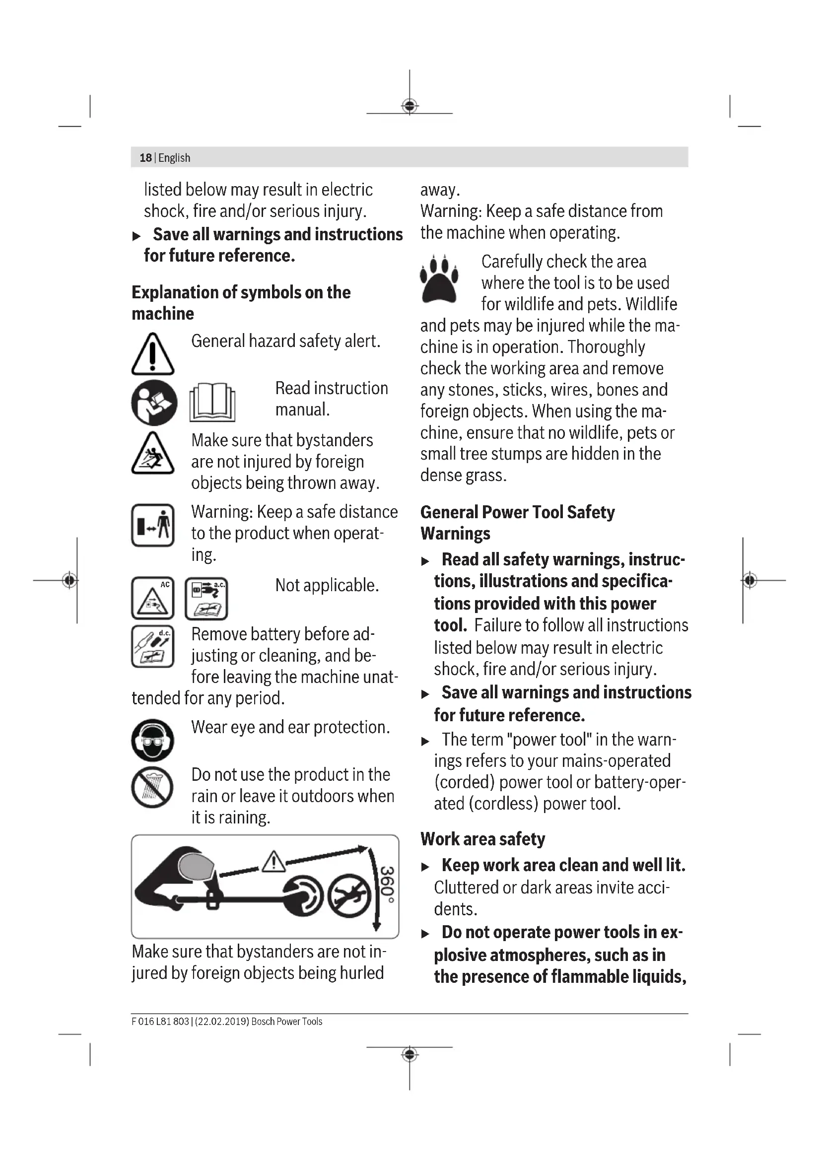 the machine when operating. Carefully check the area where the tool is to be used for wildlife and pets. Wildlife and pets may be injured while the ma- chine is in operation. Thoroughly check the working area and remove any stones, sticks, wires, bones and foreign objects. When using the ma- chine, ensure that no wildlife, pets or small tree stumps are hidden in the dense grass. General Power Tool Safety Warnings u Read all safety warnings, instruc- tions, illustrations and specifica- tions provided with this power tool. Failure to follow all instructions listed below may result in electric shock, fire and/or serious injury. u Save all warnings and instructions for future reference. u The term "power tool" in the warn- ings refers to your mains-operated (corded) power tool or battery-oper- ated (cordless) power tool. Work area safety u Keep work area clean and well lit. Cluttered or dark areas invite acci- dents. u Do not operate power tools in ex- plosive atmospheres, such as in the presence of flammable liquids, F 016 L81 803 | (22.02.2019) Bosch Power ToolsEnglish | 19 gases or dust. Power tools create sparks which may ignite the dust or fumes. u Keep children and bystanders away while operating a power tool. Distractions can cause you to lose control. Never operate the power tool while people, especially children, or pets are nearby. Electrical safety u Power tool plugs must match the outlet. Never modify the plug in any way. Do not use any adapter plugs with earthed (grounded) power tools. Unmodified plugs and matching outlets will reduce risk of electric shock. u Avoid body contact with earthed or grounded surfaces, such as pipes, radiators, ranges and refri- gerators. There is an increased risk of electric shock if your body is earthed or grounded. u Do not expose power tools to rain or wet conditions. Water entering a power tool will increase the risk of electric shock. u Do not abuse the cord. Never use the cord for carrying, pulling or un- plugging the power tool. Keep cord away from heat, oil, sharp edges or moving parts. Damaged or entangled cords increase the risk of electric shock. u When operating a power tool out- doors, use an extension cord suit- able for outdoor use. Use of a cord suitable for outdoor use reduces the risk of electric shock. u If operating a power tool in a damp location is unavoidable, use a re- sidual current device (RCD) pro- tected supply. Use of an RCD re- duces the risk of electric shock. Personal safety u Stay alert, watch what you are do- ing and use common sense when operating a power tool. Do not use a power tool while you are tired or under the influence of drugs, alco- hol or medication. A moment of in- attention while operating power tools may result in serious personal injury. u Use personal protective equip- ment. Always wear eye protec- tion. Protective equipment such as a dust mask, non-skid safety shoes, hard hat or hearing protection used for appropriate conditions will re- duce personal injuries. u Prevent unintentional starting. En- sure the switch is in the off-posi- tion before connecting to power source and/or battery pack, pick- ing up or carrying the tool. Carry- ing power tools with your finger on the switch or energising power tools that have the switch on invites acci- dents. u Remove any adjusting key or wrench before turning the power Bosch Power Tools F 016 L81 803 | (22.02.2019)20 | English tool on. A wrench or a key left at- tached to a rotating part of the power tool may result in personal in- jury. u Do not overreach. Keep proper footing and balance at all times, never run. This enables better con- trol of the power tool in unexpected situations. u Dress properly. Do not wear loose clothing or jewellery. Keep your hair and clothing away from mov- ing parts. Loose clothes, jewellery or long hair can be caught in moving parts. Always wear substantial foot- wear and long trousers while operat- ing the power tool. u If devices are provided for the con- nection of dust extraction and col- lection facilities, ensure these are connected and properly used. Use of dust collection can reduce dust- related hazards. u Do not let familiarity gained from frequent use of tools allow you to become complacent and ignore tool safety principles. A careless action can cause severe injury within a fraction of a second. Power tool use and care u Do not force the power tool. Use the correct power tool for your ap- plication. The correct power tool will do the job better and safer at the rate for which it was designed. u Do not use the power tool if the switch does not turn it on and off. Any power tool that cannot be con- trolled with the switch is dangerous and must be repaired. u Disconnect the plug from the power source and/or remove the battery pack, if detachable, from the power tool before making any adjustments, changing accessor- ies, or storing power tools. Such preventive safety measures reduce the risk of starting the power tool ac- cidentally. u Store idle power tools out of the reach of children and do not allow persons unfamiliar with the power tool or these instructions to oper- ate the power tool. Power tools are dangerous in the hands of untrained users. u Maintain power tools. Check for misalignment or binding of moving parts, breakage of parts and any other condition that may affect the power tool’s operation. If dam- aged, have the power tool repaired before use. Many accidents are caused by poorly maintained power tools. u Keep cutting tools sharp and clean. Properly maintained cutting tools with sharp cutting edges are less likely to bind and are easier to control. u Use the power tool, accessories and tool bits etc. in accordance F 016 L81 803 | (22.02.2019) Bosch Power ToolsEnglish | 21 with these instructions, taking into account the working condi- tions and the work to be per- formed. Use of the power tool for operations different from those in- tended could result in a hazardous situation. u Keep handles and gra
