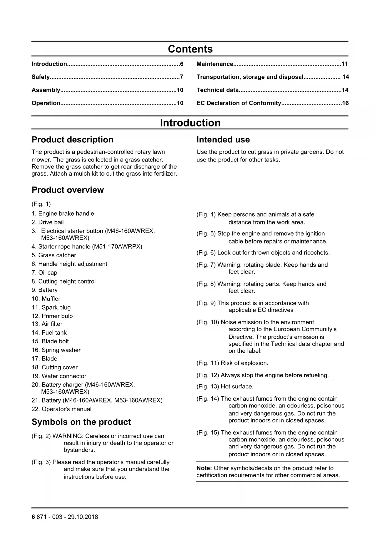 Symbols on the product (Fig. 2) WARNING: Careless or incorrect use can result in injury or death to the operator or bystanders. (Fig. 3) Please read the operator's manual carefully and make sure that you understand the instructions before use. (Fig. 4) Keep persons and animals at a safe distance from the work area. (Fig. 5) Stop the engine and remove the ignition cable before repairs or maintenance. (Fig. 6) Look out for thrown objects and ricochets. (Fig. 7) Warning: rotating blade. Keep hands and feet clear. (Fig. 8) Warning: rotating parts. Keep hands and feet clear. (Fig. 9) This product is in accordance with applicable EC directives (Fig. 10) Noise emission to the environment according to the European Community’s Directive. The product’s emission is specified in the Technical data chapter and on the label. (Fig. 11) Risk of explosion. (Fig. 12) Always stop the engine before refueling. (Fig. 13) Hot surface. (Fig. 14) The exhaust fumes from the engine contain carbon monoxide, an odourless, poisonous and very dangerous gas. Do not run the product indoors or in closed spaces. (Fig. 15) The exhaust fumes from the engine contain carbon monoxide, an odourless, poisonous and very dangerous gas. Do not run the product indoors or in closed spaces. Note: Other symbols/decals on the product refer to certification requirements for other commercial areas. 6 871 - 003 - 29.10.2018EU V