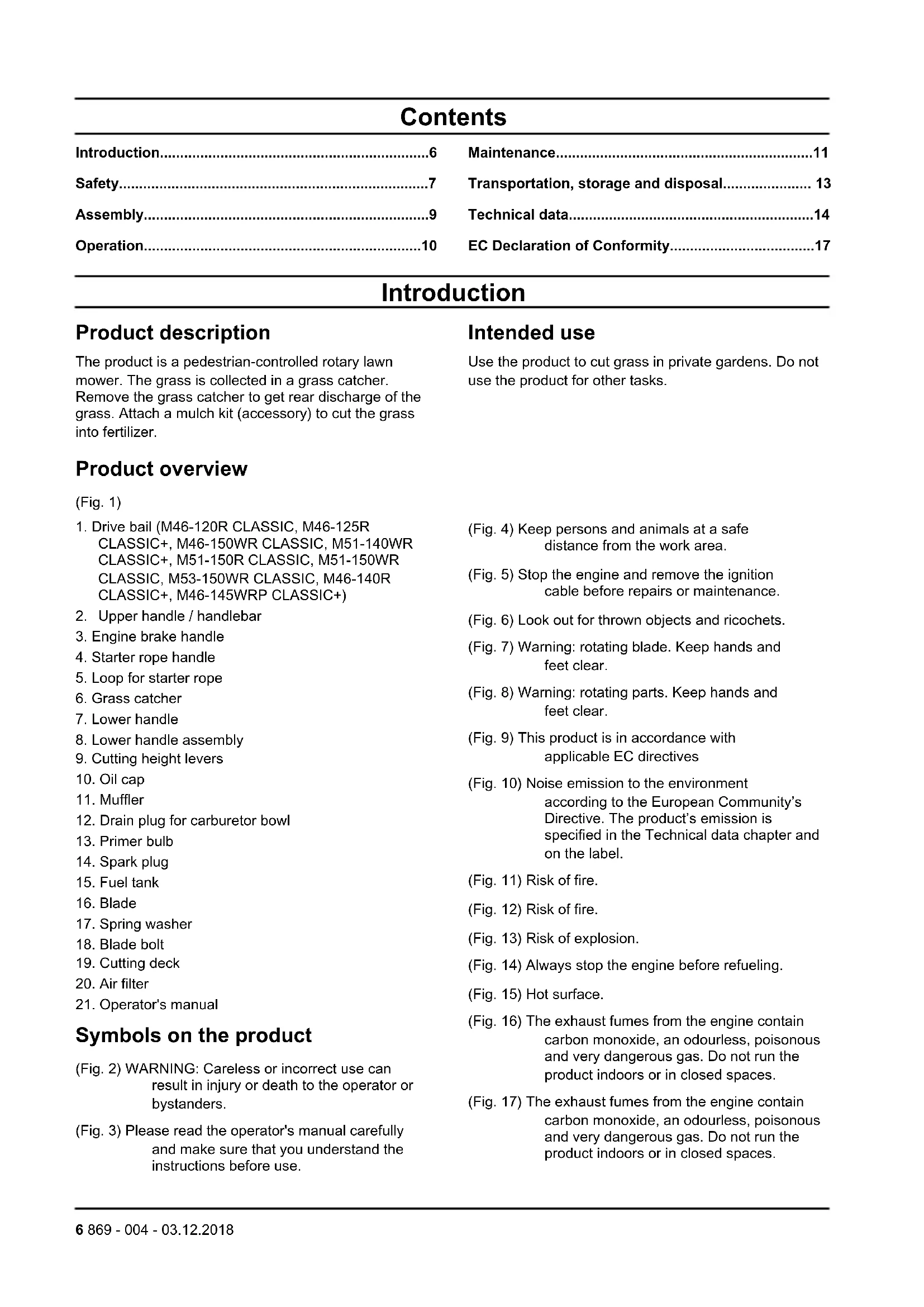 Symbols on the product (Fig. 2) WARNING: Careless or incorrect use can result in injury or death to the operator or bystanders. (Fig. 3) Please read the operator's manual carefully and make sure that you understand the instructions before use. (Fig. 4) Keep persons and animals at a safe distance from the work area. (Fig. 5) Stop the engine and remove the ignition cable before repairs or maintenance. (Fig. 6) Look out for thrown objects and ricochets. (Fig. 7) Warning: rotating blade. Keep hands and feet clear. (Fig. 8) Warning: rotating parts. Keep hands and feet clear. (Fig. 9) This product is in accordance with applicable EC directives (Fig. 10) Noise emission to the environment according to the European Community’s Directive. The product’s emission is specified in the Technical data chapter and on the label. (Fig. 11) Risk of fire. (Fig. 12) Risk of fire. (Fig. 13) Risk of explosion. (Fig. 14) Always stop the engine before refueling. (Fig. 15) Hot surface. (Fig. 16) The exhaust fumes from the engine contain carbon monoxide, an odourless, poisonous and very dangerous gas. Do not run the product indoors or in closed spaces. (Fig. 17) The exhaust fumes from the engine contain carbon monoxide, an odourless, poisonous and very dangerous gas. Do not run the product indoors or in closed spaces. 6 869 - 004 - 03.12.2018Note: Other symbols/decals on the product refer to certification requirements for other commercial areas. EU V
