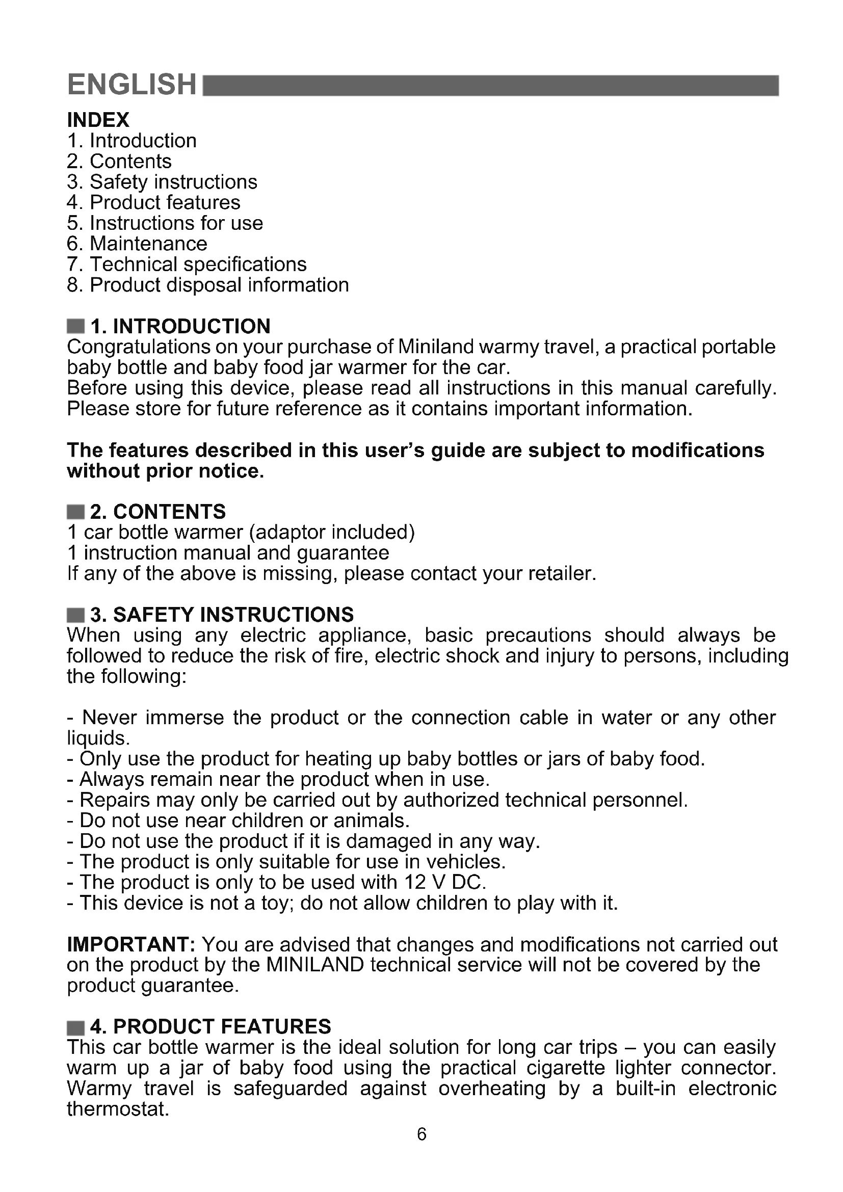 When using any electric appliance, basic precautions should always be followed to reduce the risk of re, electric shock and injury to persons, including the following: - Never immerse the product or the connection cable in water or any other liquids. - Only use the product for heating up baby bottles or jars of baby food. - Always remain near the product when in use. - Repairs may only be carried out by authorized technical personnel. - Do not use near children or animals. - Do not use the product if it is damaged in any way. - The product is only suitable for use in vehicles. - The product is only to be used with 12 V DC. - This device is not a toy; do not allow children to play with it. IMPORTANT: You are advised that changes and modications not carried out on the product by the MINILAND technical service will not be covered by the product guarantee.
