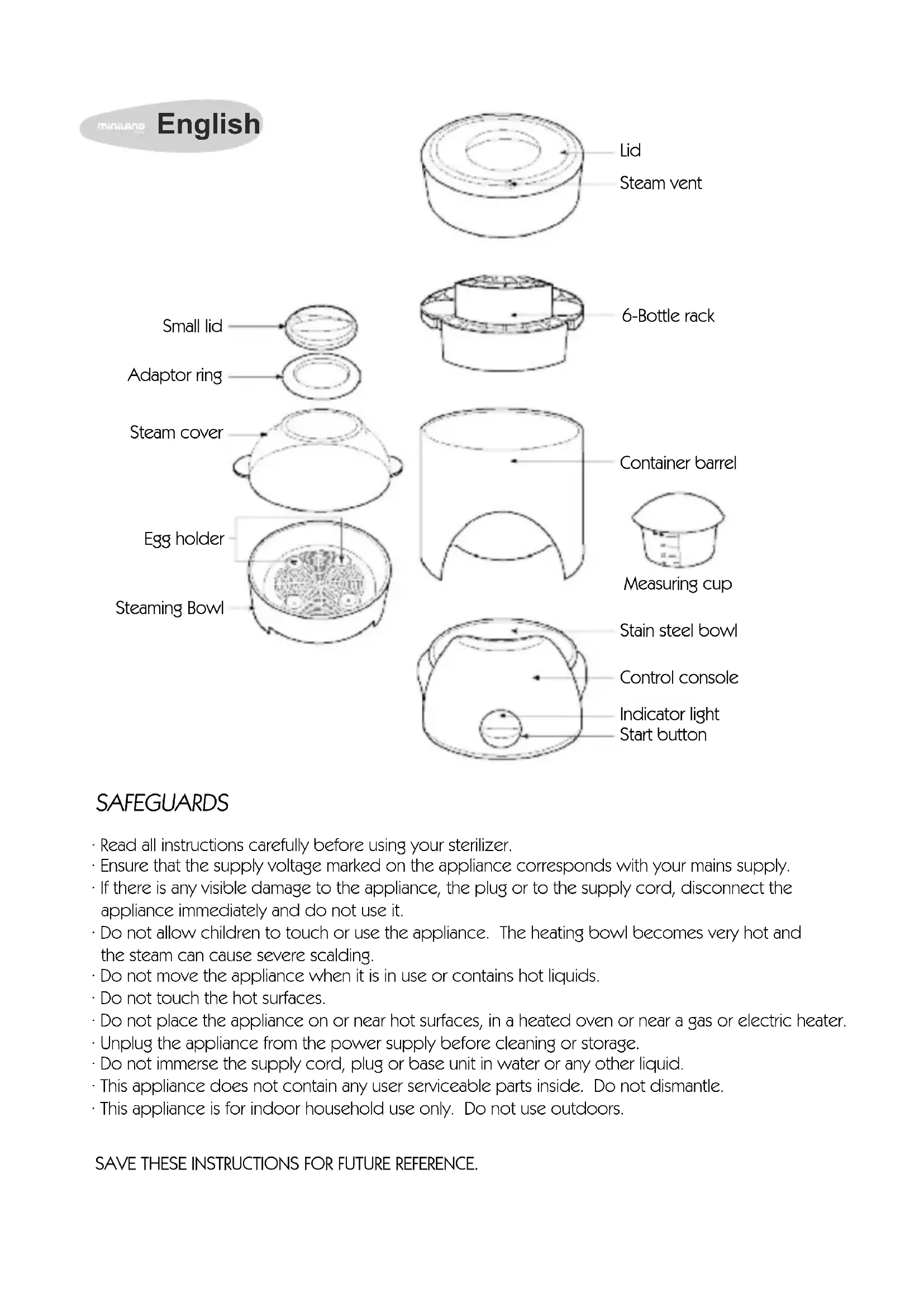 - This appliance is for indoor household use only. Do not use outdoors. SAVE THESE INSTRUCTIONS FOR FUTURE REFERENCE. English21 ml 17 ml 24 ml 20 ml OPERATING INSTRUCTIONS Bottle Sterilization: Before placing items in the appliance for sterilization it is important that all bottles, teats and accessories are empty and that they are cleaned and fully rinsed in fresh water.