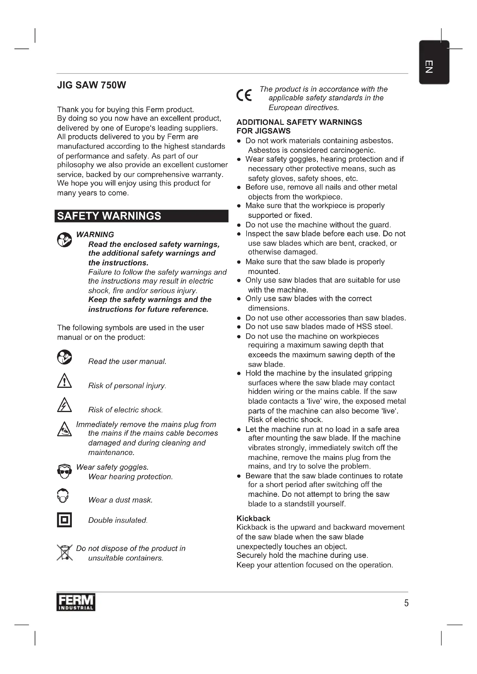 Thank you for buying this Ferm product. By doing so you now have an excellent product, delivered by one of Europe‘s leading suppliers. All products delivered to you by Ferm are manufactured according to the highest standards of performance and safety. As part of our philosophy we also provide an excellent customer service, backed by our comprehensive warranty. We hope you will enjoy using this product for many years to come. SAFETY WARNINGS