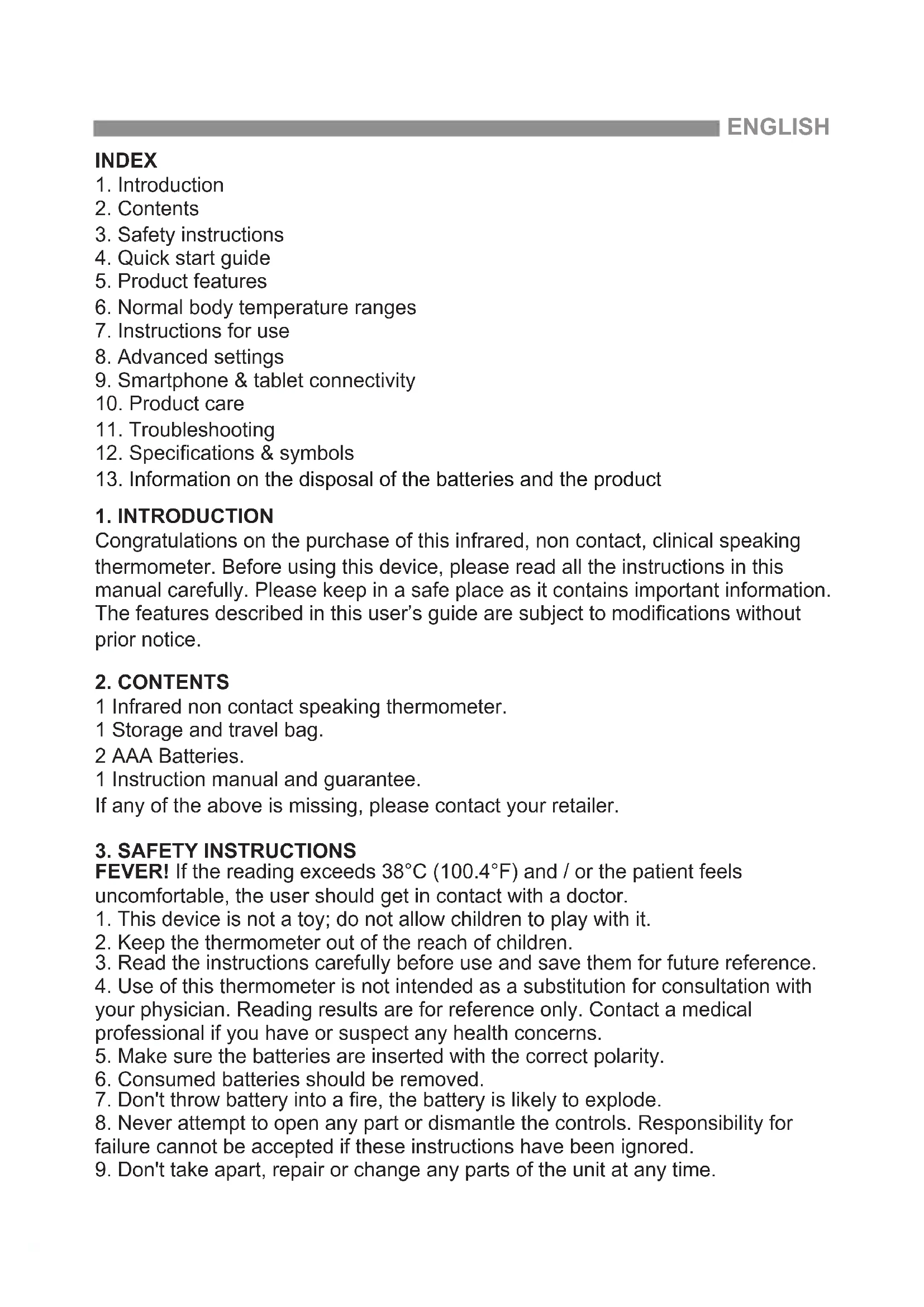 Congratulations on the purchase of this infrared, non contact, clinical speaking thermometer. Before using this device, please read all the instructions in this manual carefully. Please keep in a safe place as it contains important information. The features described in this user’s guide are subject to modifications without prior notice.