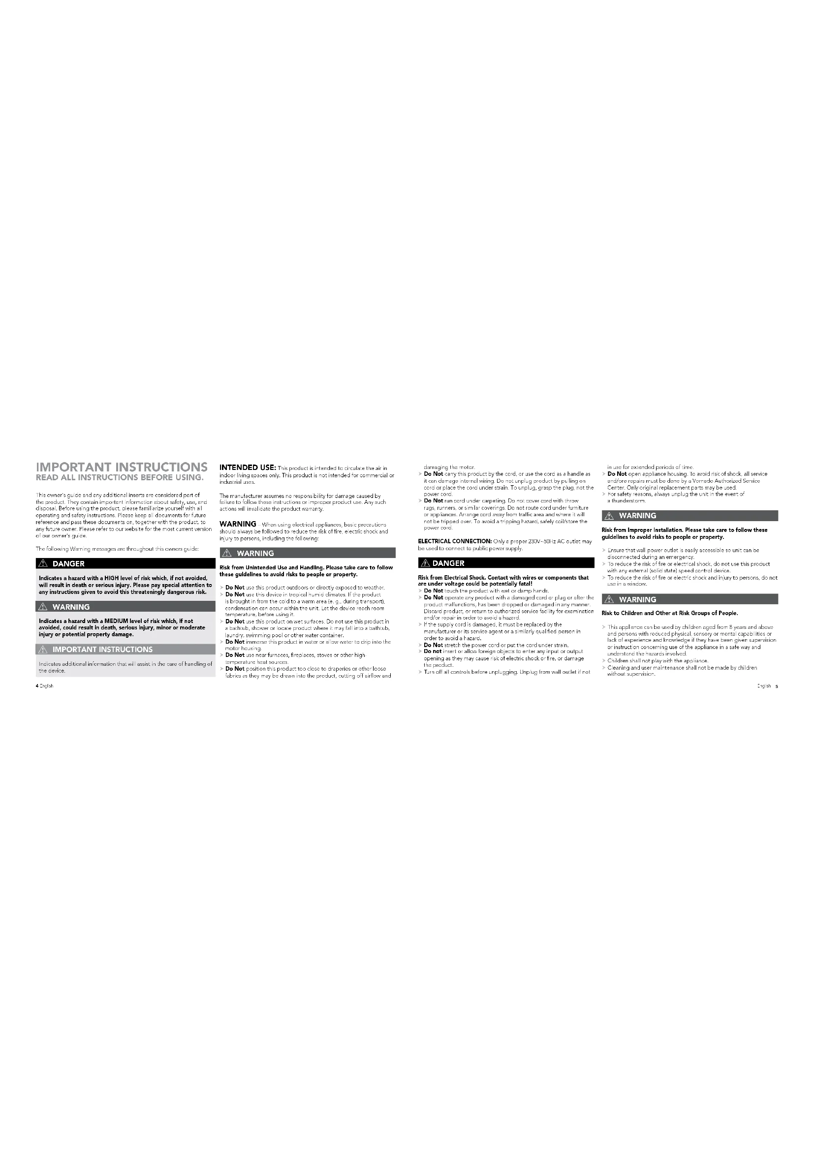 - Warranty CONTENTS Deutsch p. 17 Français p. 32 Nederlands p. 48 Italiano p. 63 Português p. 78 Español p. 93 Czech p. 109 Swedish p. 124 Slovak p. 1395 English 4 English This owner's guide and any additional inserts are considered part of the product. They contain important information about safety, use, and disposal. Before using the product, please familiarize yourself with all operating and safety instructions. Please keep all documents for future reference and pass these documents on, together with the product, to any future owner. Please refer to our website for the most current version of our owner’s guide. The following Warning messages are throughout this owners guide: DANGER Indicates a hazard with a HIGH level of risk which, if not avoided, will result in death or serious injury. Please pay special attention to any instructions given to avoid this threateningly dangerous risk. WARNING Indicates a hazard with a MEDIUM level of risk which, if not avoided, could result in death, serious injury, minor or moderate injury or potential property damage. IMPORTANT INSTRUCTIONS Indicates additional information that will assist in the care of handling of the device. INTENDED USE: This product is intended to circulate the air in indoor living spaces only. This product is not intended for commercial or industrial uses. The manufacturer assumes no responsibility for damage caused by failure to follow these instructions or improper product use. Any such actions will invalidate the product warranty. WARNING – When using electrical appliances, basic precautions should always be followed to reduce the risk of fire, electric shock and injury to persons, including the following: WARNING Risk from Unintended Use and Handling. Please take care to follow these guidelines to avoid risks to people or property. Do Not use this product outdoors or directly exposed to weather. Do Not use this device in tropical humid climates. If the product is brought in from the cold to a warm area (e. g., during transport), condensation can occur within the unit. Let the device reach room temperature, before using it. Do Not use this product on wet surfaces. Do not use this product in a bathtub, shower or locate product where it may fall into a bathtub, laundry, swimming pool or other water container. Do Not immerse this product in water or allow water to drip into the motor housing. Do Not use near furnaces, fireplaces, stoves or other high- temperature heat sources. Do Not position this product too close to draperies or other loose fabrics as they may be drawn into the product, cutting off airflow and IMPORTANT INSTRUCTIONS READ ALL INSTRUCTIONS BEFORE USING. damaging the motor. Do Not carry this product by the cord, or use the cord as a handle as it can damage internal wiring. Do not unplug product by pulling on cord or place the cord under strain. To unplug, grasp the plug, not the power cord. Do Not run cord under carpeting. Do not cover cord with throw rugs, runners, or similar coverings. Do not route cord under furniture or appliances. Arrange cord away from traffic area and where it will not be tripped over. To avoid a tripping hazard, safely coil/store the power cord. ELECTRICAL CONNECTION: Only a proper 230V~50Hz AC outlet may be used to connect to public power supply. DANGER Risk from Electrical Shock. Contact with wires or components that are under voltage could be potentially fatal! Do Not touch the product with wet or damp hands. Do Not operate any product with a damaged cord or plug or after the product malfunctions, has been dropped or damaged in any manner. Discard product, or return to authorized service facility for examination and/or repair in order to avoid a hazard. If the supply cord is damaged, it must be replaced by the manufacturer or its service agent or a similarly qualified person in order to avoid a hazard. Do Not stretch the power cord or put the cord under strain. Do not insert or allow foreign objects to enter any input or output opening as they may cause risk of electric shock or fire, or damage the product. Turn off all controls before unplugging. Unplug from wall outlet if not in use for extended periods of time. Do Not open appliance housing. To avoid risk of shock, all service and/ore repairs must be done by a Vornado Authorized Service Center. Only original replacement parts may be used. For safety reasons, always unplug the unit in the event of a thunderstorm. WARNING Risk from Improper Installation. Please take care to follow these guidelines to avoid risks to people or property. Ensure that wall power outlet is easily accessible so unit can be disconnected during an emergency. To reduce the risk of fire or electrical shock, do not use this product with any external (solid state) speed control device. To reduce the risk of fire or electric shock and injury to persons, do not use in a window. WARNING Risk to Children and Other at Risk Groups of People. This appliance can be used by children aged from 8 years and above and persons with reduced physical, sensory or mental capabilities or lack of experience and knowledge if they have been given supervision or instruction concerning use of the appliance in a safe way and understand the hazards involved. Children shall not play with the appliance. Cleaning and user maintenance shall not be made by children without supervision.7 English 6 English This product and its packaging material are not toys and should be kept out of reach of children. Information Regarding the EC Declaration of Conformity This product conforms with all relevant and necessary EC directives, including: - Low Voltage Directive (LVD) - Electromagnetic Compatibility Directive (EMC) - Energy Related Product Directive (ErP) - Restriction of Hazardous Substances Directive (RoHS) - Registration, Evaluation, Authorisation, and Restriction of Chemicals (REACH) The complete Declaration of Conformity is registered and can be obtained from the importer. PACKAGE RECY