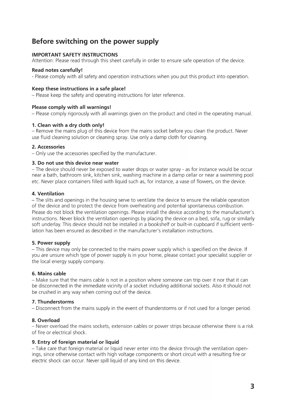 – Take care that foreign material or liquid never enter into the device through the ventilation open- ings,sinceotherwisecontactwithhighvoltagecomponentsorshortcircuitwitharesultingreor electric shock can occur. Never spill liquid of any kind on this device.