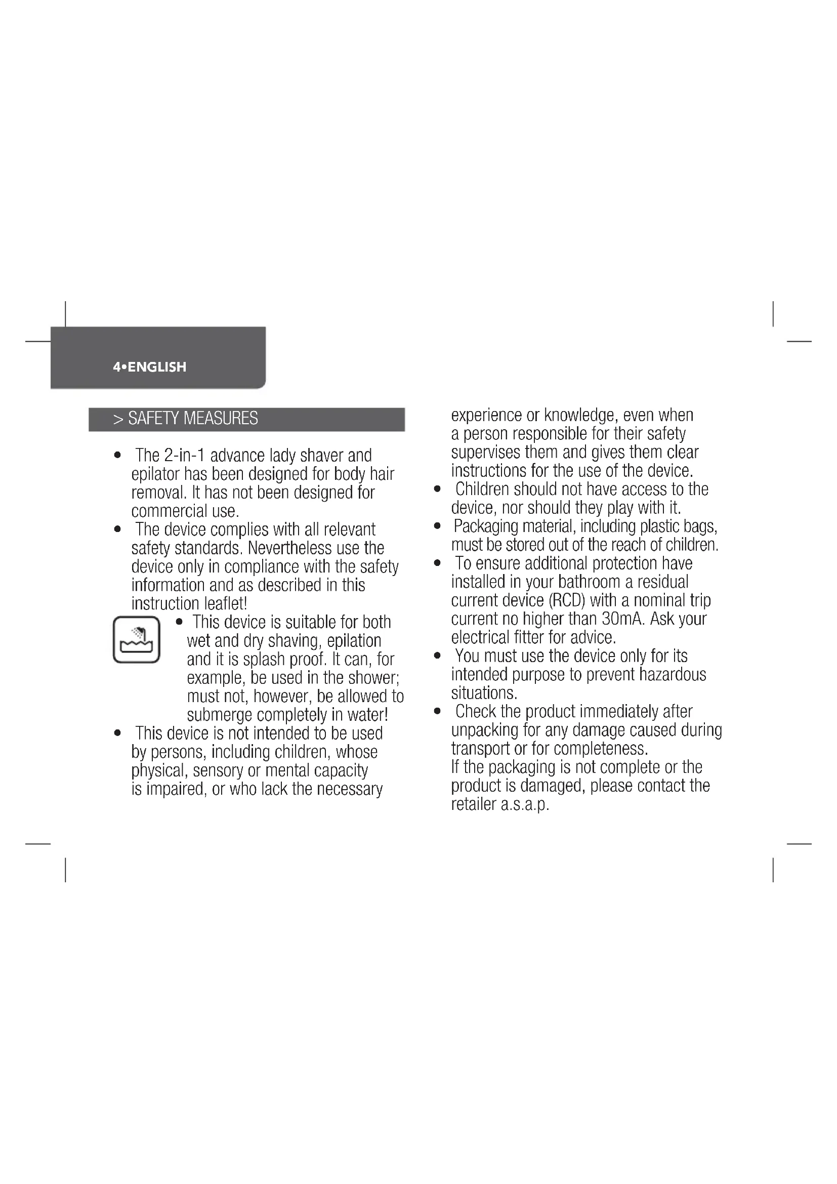 This device is suitable for both wet and dry shaving, epilation and it is splash proof. It can, for example, be used in the shower; must not, however, be allowed to submerge completely in water!