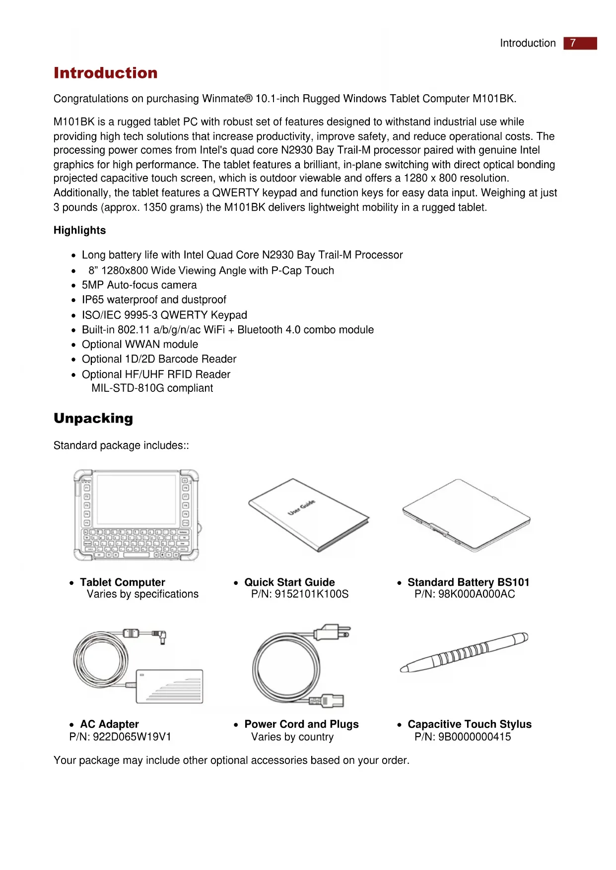 AC Adapter P/N: 922D065W19V1 Power Cord and Plugs Varies by country Capacitive Touch Stylus P/N: 9B0000000415 Your package may include other optional accessories based on your order.8 Rugged Windows Tablet M101BK Description of Parts Front: