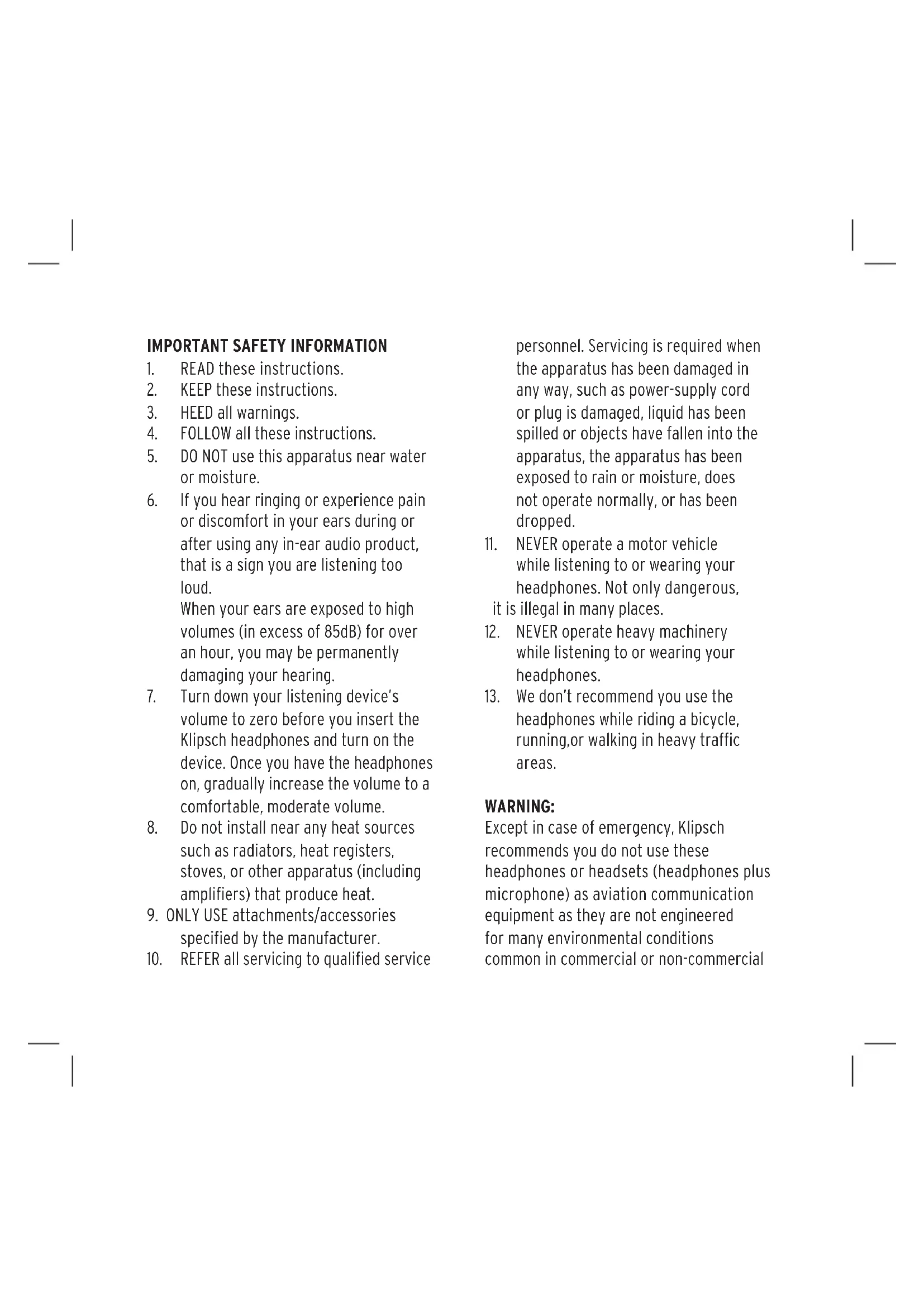 Except in case of emergency, Klipsch recommends you do not use these headphones or headsets (headphones plus microphone) as aviation communication equipment as they are not engineered for many environmental conditions common in commercial or non-commercialaircraft (including, but not limited to: altitude, temperature, noise conditions, unpressurized aircraft, etc.) resulting in possible interference to critical communications. The Occupational Safety Health Administration (OSHA) has issued headphone usage recommendations for maximum daily exposure and sound pressure levels (measured in decibels (dB)). A decibel is a unit of measure of sound, and decibels increase exponentially as sound gets louder. For example, conversational speech is typically around 60dB, and a rock concert in a stadium is often about 110dB.