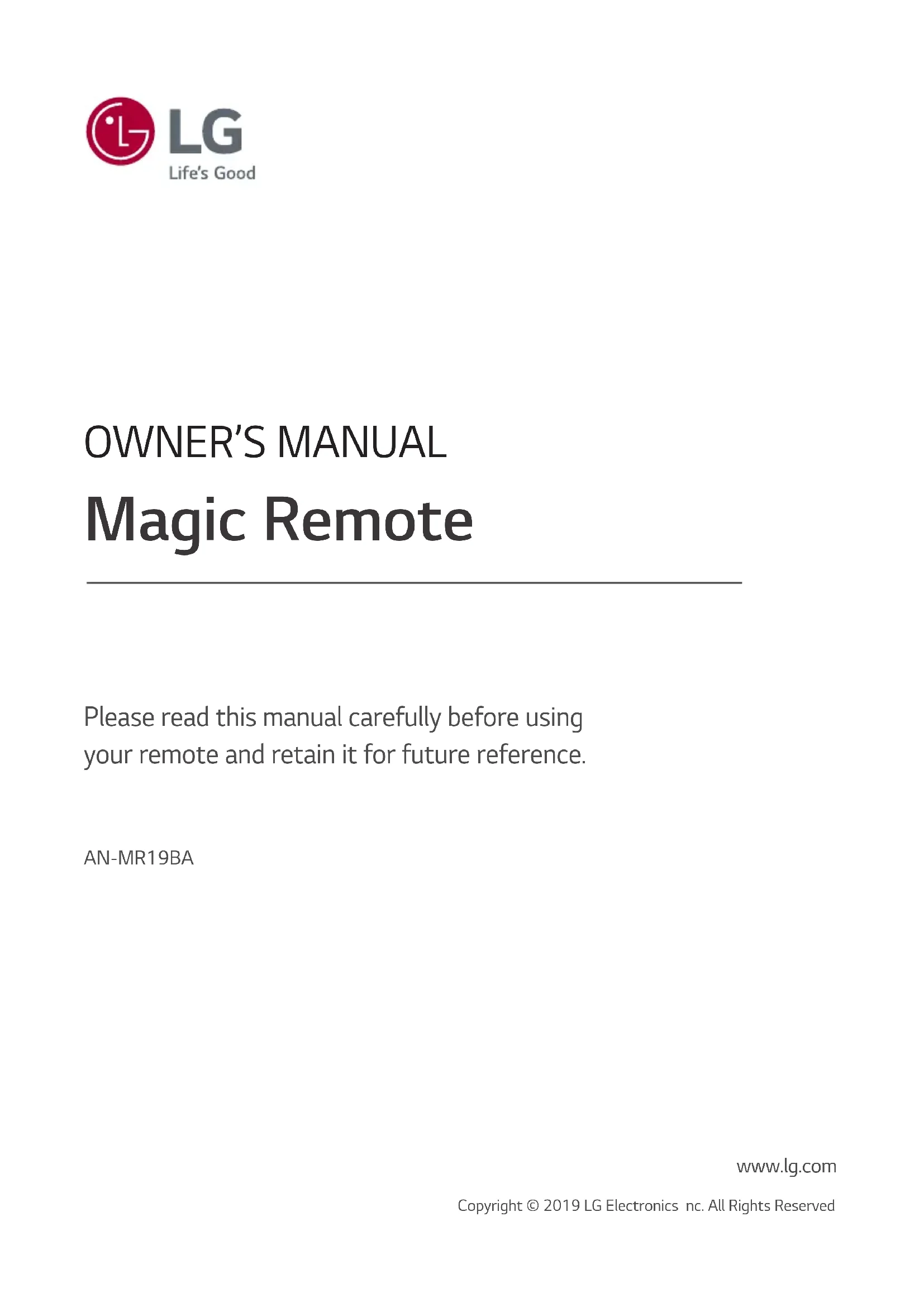 www.lg.com Copyright © 2019 LG Electronics nc. All Rights Reserved.2 ACCESSORIES The remote control image shown may differ from the actual product. ( Depending on country) Magic Remote and Alkaline Batteries (AA) Owner’s manual