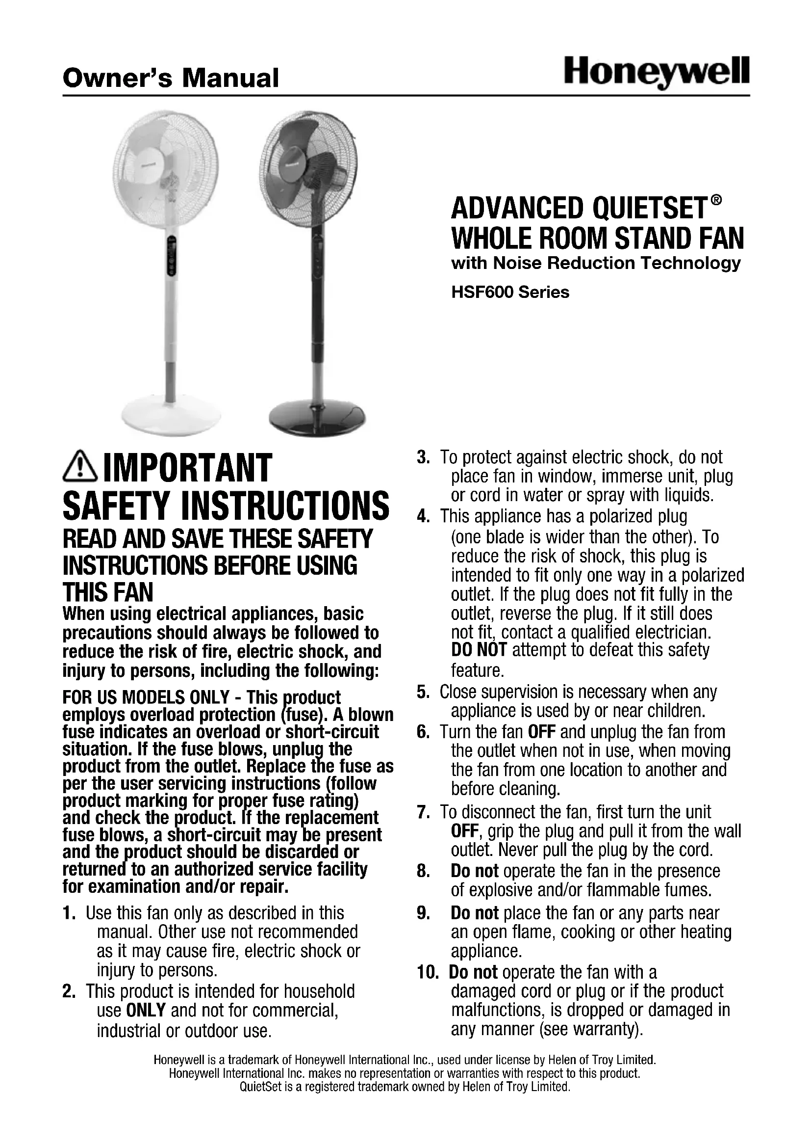 with Noise Reduction TechnologyHSF600 Series Owner’s Manual Honeywell is a trademark of Honeywell International Inc., used under license by Helen of Troy Limited. Honeywell International Inc. makes no representation or warranties with respect to this product.QuietSet is a registered trademark owned by Helen of Troy Limited.2 FUSED SAFETY PLUG - FOR US MODELS ONLY
