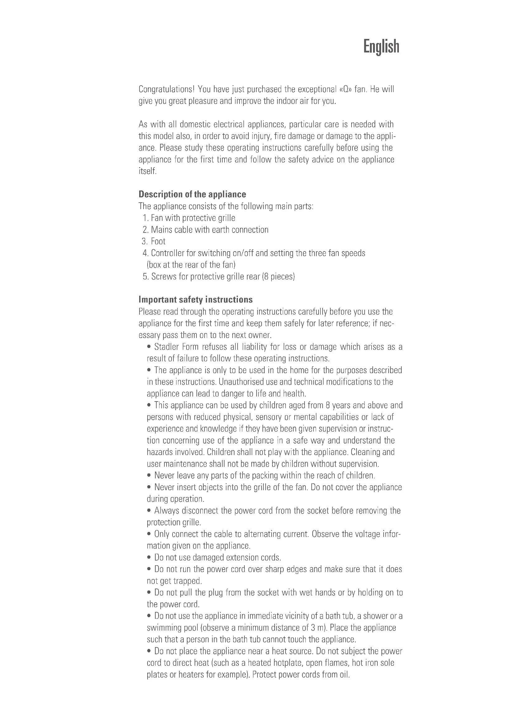 Download the instructions for your Fan in PDF format for free! Find your manual Q Fan - STADLER FORM and take your electronic device back in hand. On this page are published all the documents necessary for the use of your device. Q Fan by STADLER FORM.