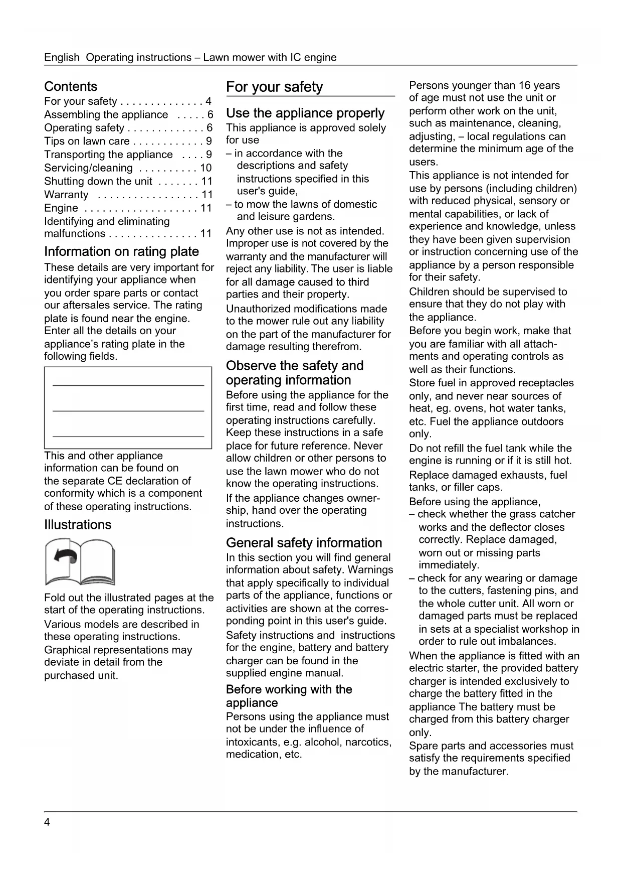 - Identifying and eliminating malfunctions Information on rating plate These details are very important for identifying your appliance when you order spare parts or contact our aftersales service. The rating plate is found near the engine. Enter all the details on your appliance’s rating plate in the following fields. This and other appliance information can be found on the separate CE declaration of conformity which is a component of these operating instructions. Illustrations Fold out the illustrated pages at the start of the operating instructions. Various models are described in these operating instructions. Graphical representations may deviate in detail from the purchased unit. For your safety Use the appliance properly This appliance is approved solely for use – in accordance with the descriptions and safety instructions specified in this user's guide, – to mow the lawns of domestic and leisure gardens. Any other use is not as intended. Improper use is not covered by the warranty and the manufacturer will reject any liability. The user is liable for all damage caused to third parties and their property. Unauthorized modifications made to the mower rule out any liability on the part of the manufacturer for damage resulting therefrom. Observe the safety and operating information Before using the appliance for the first time, read and follow these operating instructions carefully. Keep these instructions in a safe place for future reference. Never allow children or other persons to use the lawn mower who do not know the operating instructions. If the appliance changes owner- ship, hand over the operating instructions. General safety information In this section you will find general information about safety. Warnings that apply specifically to individual parts of the appliance, functions or activities are shown at the corres- ponding point in this user's guide. Safety instructions and instructions for the engine, battery and battery charger can be found in the supplied engine manual. Before working with the appliance Persons using the appliance must not be under the influence of intoxicants, e.g. alcohol, narcotics, medication, etc. Persons younger than 16 years of age must not use the unit or perform other work on the unit, such as maintenance, cleaning, adjusting, – local regulations can determine the minimum age of the users. This appliance is not intended for use by persons (including children) with reduced physical, sensory or mental capabilities, or lack of experience and knowledge, unless they have been given supervision or instruction concerning use of the appliance by a person responsible for their safety. Children should be supervised to ensure that they do not play with the appliance. Before you begin work, make that you are familiar with all attach- ments and operating controls as well as their functions. Store fuel in approved receptacles only, and never near sources of heat, eg. ovens, hot water tanks, etc. Fuel the appliance outdoors only. Do not refill the fuel tank while the engine is running or if it is still hot. Replace damaged exhausts, fuel tanks, or filler caps. Before using the appliance, – check whether the grass catcher works and the deflector closes correctly. Replace damaged, worn out or missing parts immediately. – check for any wearing or damage to the cutters, fastening pins, and the whole cutter unit. All worn or damaged parts must be replaced in sets at a specialist workshop in order to rule out imbalances. When the appliance is fitted with an electric starter, the provided battery charger is intended exclusively to charge the battery fitted in the appliance The battery must be charged from this battery charger only. Spare parts and accessories must satisfy the requirements specified by the manufacturer.Operating instructions – Lawn mower with IC engine English Therefore use original spare parts and original accessories only or spare parts and accessories authorised by the manufacturer.All repair work must be conducted exclusively at a specialised garage. When working with the appliance When working with or on the appliance you must wear protective clothing. This includes:– safety shoes,– trousers,– close-fitting garments,– hearing protection,– protective goggles, etc.All safety devices must be installed on the appliance, and they must be complete and in a fully functional condition.Do not make any changes to the safety devices.Operate the vehicle only when it is in good technical condition as stipulated and delivered by the manufacturer.Never change the engine settings preset at the factory.Keep away from naked flames, avoid creating sparks and do not smoke. Before all work on this appliance If the lawn mower has an engine, always turn off it off before doing any working on it (e.g. repair work and adjustments) and before transporting it (e.g. lifting or carrying) in order to avoid injury– switch OFF the engine,– remove the ignition key (if used),– wait until all moving parts have come to a complete stop and the engine has cooled down,– remove the spark plug connector on the engine in order to prevent the engine from accidentally being started,– remove the starter battery from the engine,– which takes into account additional safety information in the engine manual. After working with the appliance Never leave the unit without switching off the engine and – if used – without removing the ignition key. Safety devices Fig. 1 Danger Never use a lawn mower if it has damaged safety devices or if there are no safety devices fitted. Safety lever (1) The safety lever stops the motor and cutting blades in an emergency. There must be no attempt to circumvent this function, which is crucial for your personal safety. Ejection flap (2) or impact protection (3) The ejection flap/impact protection protects you from being injured by the blade or by ejected solid objects. The lawn mower must always be operated with the ejection f