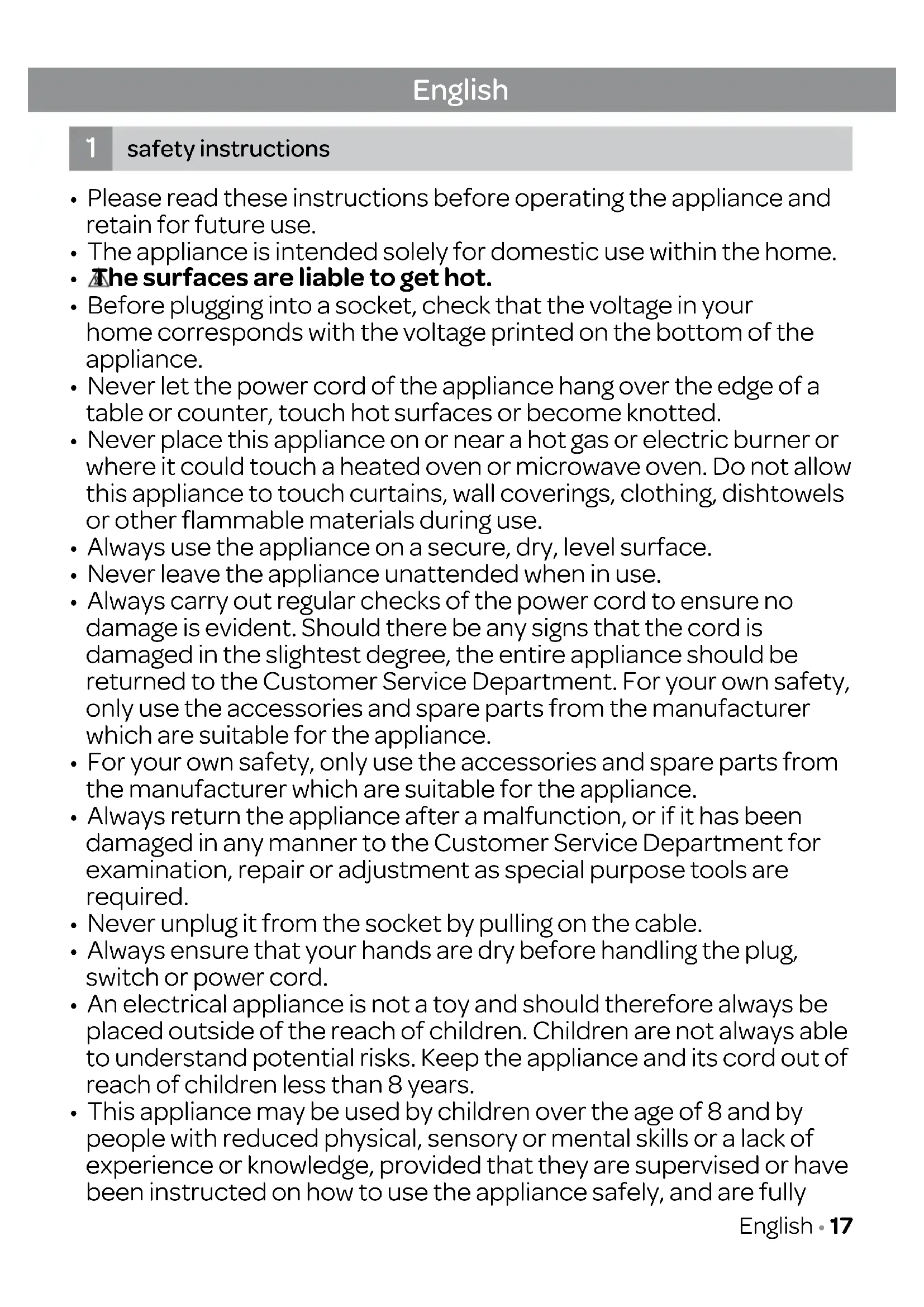 - An electrical appliance is not a toy and should therefore always be placed outside of the reach of children. Children are not always able to understand potential risks. Keep the appliance and its cord out of reach of children less than 8 years.