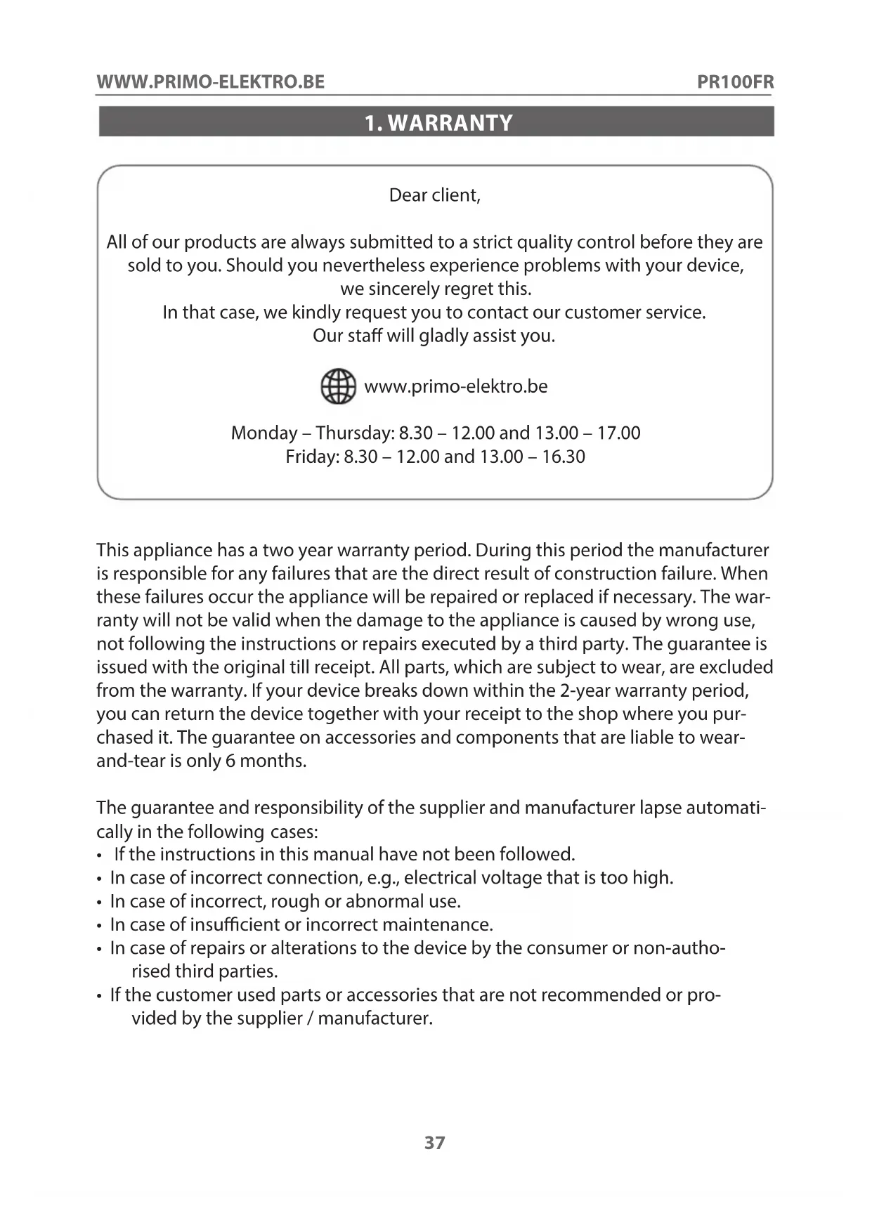 Dear client, All of our products are always submitted to a strict quality control before they are sold to you. Should you nevertheless experience problems with your device, we sincerely regret this. In that case, we kindly request you to contact our customer service. Our sta will gladly assist you. www.primo-elektro.be Monday – Thursday: 8.30 – 12.00 and 13.00 – 17.00 Friday: 8.30 – 12.00 and 13.00 – 16.30
