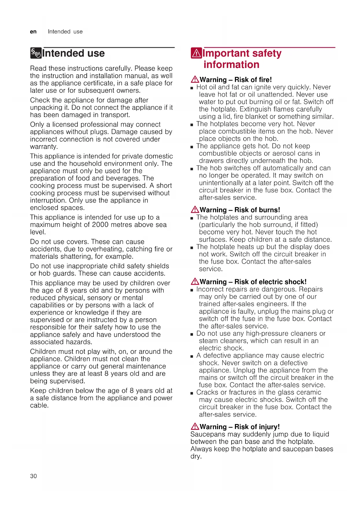 ■ The hotplates become very hot. Never place combustible items on the hob. Never place objects on the hob.