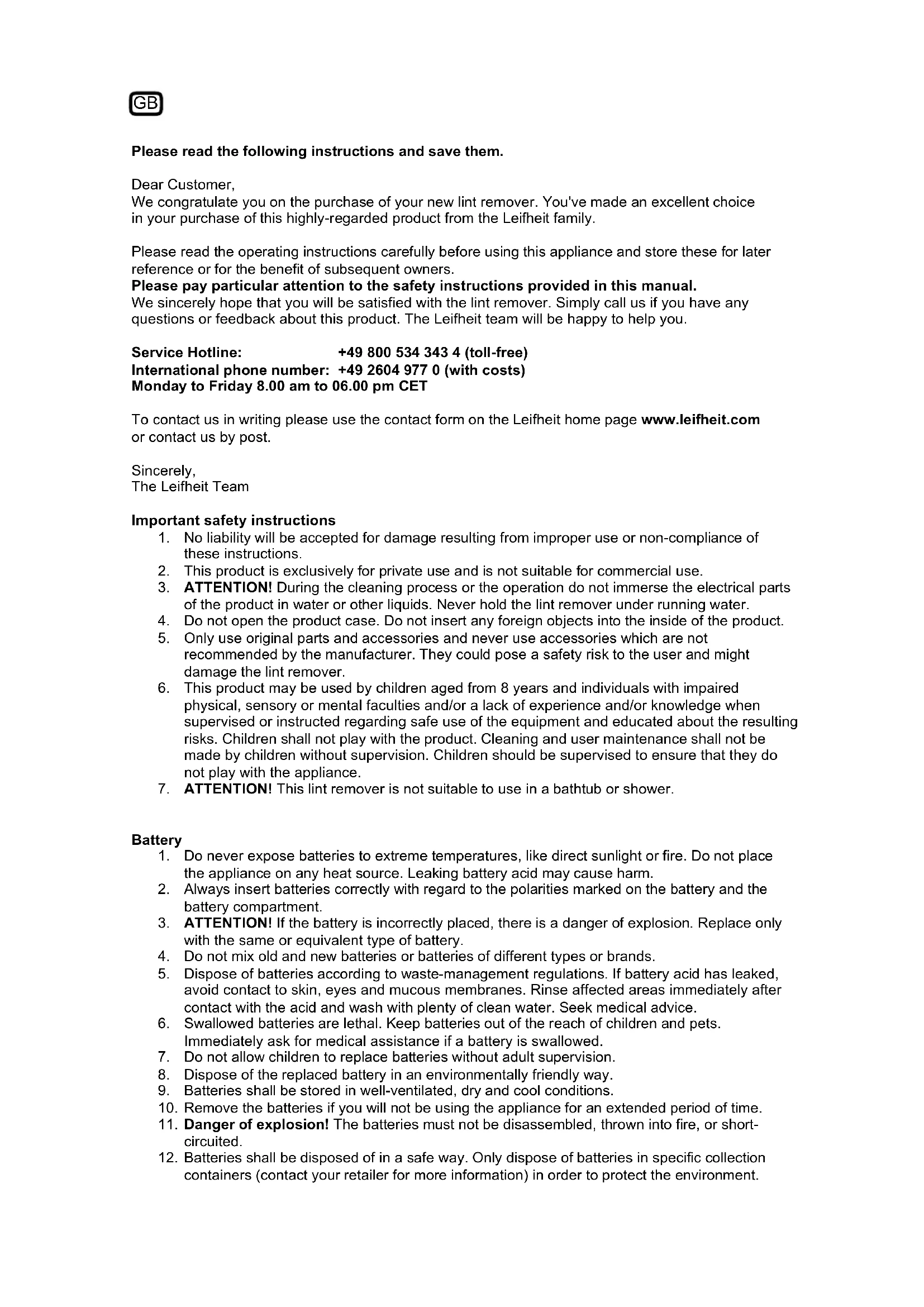 - Korrosion und/oder Rost, der durch normalen Verschleiß des Gerätes verursacht oder durch nachteilige Umweltbedingungen beschleunigt worden ist Weitere Informationen zum Thema Garantie finden Sie auf www.leifheit.de.Please read the following instructions and save them. Dear Customer, We congratulate you on the purchase of your new lint remover. You've made an excellent choice in your purchase of this highly-regarded product from the Leifheit family. Please read the operating instructions carefully before using this appliance and store these for later reference or for the benefit of subsequent owners. Please pay particular attention to the safety instructions provided in this manual. We sincerely hope that you will be satisfied with the lint remover. Simply call us if you have any questions or feedback about this product. The Leifheit team will be happy to help you. Service Hotline: +49 800 534 343 4 (toll-free) International phone number: +49 2604 977 0 (with costs) Monday to Friday 8.00 am to 06.00 pm CET To contact us in writing please use the contact form on the Leifheit home page www.leifheit.com or contact us by post. Sincerely, The Leifheit Team Important safety instructions