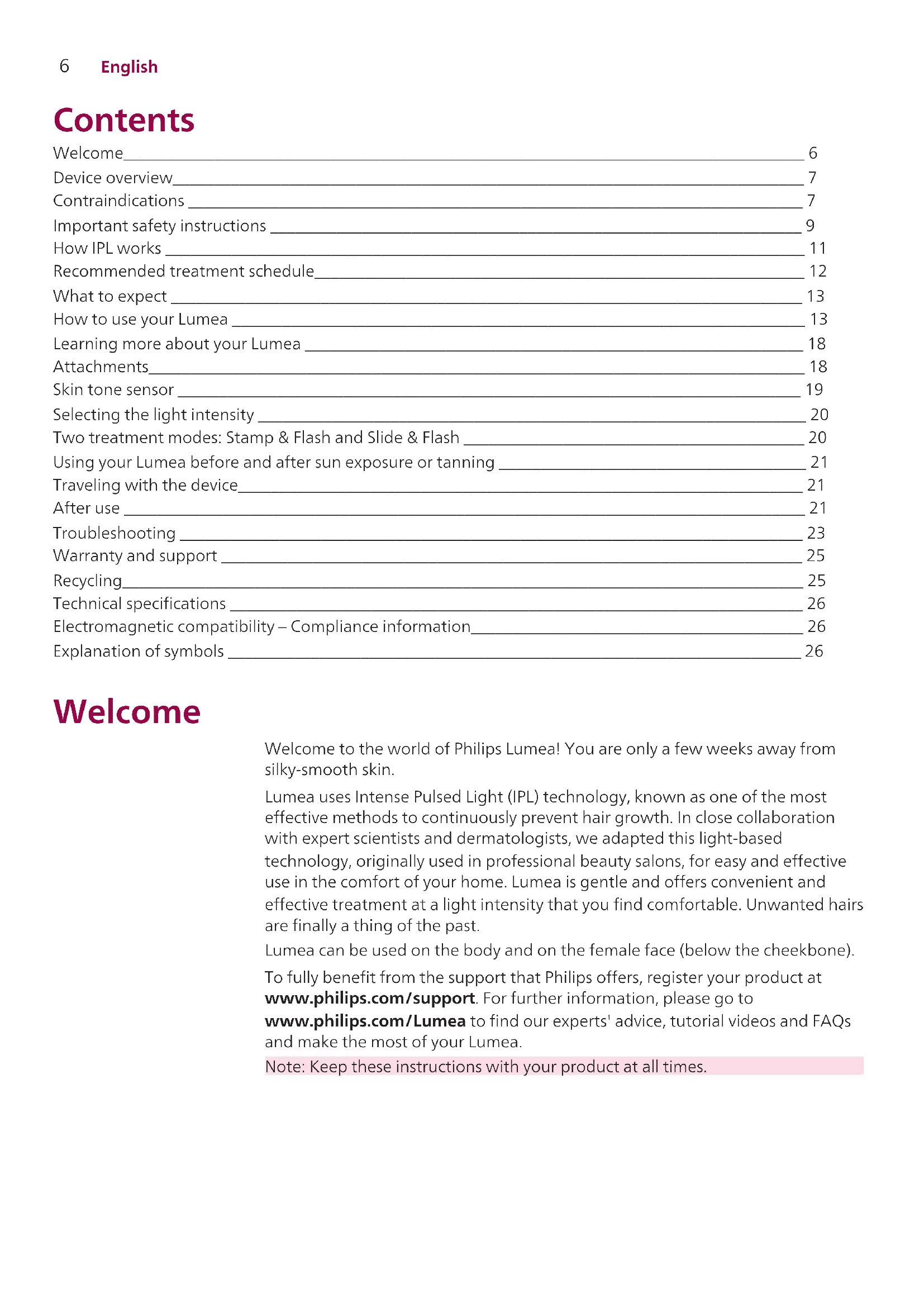 English Contents Welcome__________________________________________________________________________________ 6 Device overview____________________________________________________________________________ 7 Contraindications __________________________________________________________________________ 7 Important safety instructions ________________________________________________________________ 9 How IPL works _____________________________________________________________________________ 11 Recommended treatment schedule___________________________________________________________ 12 What to expect ____________________________________________________________________________ 13 How to use your Lumea _____________________________________________________________________ 13 Learning more about your Lumea ____________________________________________________________ 18 Attachments_______________________________________________________________________________ 18 Skin tone sensor ___________________________________________________________________________ 19 Selecting the light intensity __________________________________________________________________ 20 Two treatment modes: Stamp & Flash and Slide & Flash _________________________________________ 20 Using your Lumea before and after sun exposure or tanning _____________________________________ 21 Traveling with the device____________________________________________________________________ 21 After use __________________________________________________________________________________ 21 Troubleshooting ___________________________________________________________________________ 23 Warranty and support ______________________________________________________________________ 25 Recycling__________________________________________________________________________________ 25 Technical specifications _____________________________________________________________________ 26 Electromagnetic compatibility – Compliance information________________________________________ 26 Explanation of symbols _____________________________________________________________________ 26 Welcome Welcome to the world of Philips Lumea! You are only a few weeks away from silky-smooth skin. Lumea uses Intense Pulsed Light (IPL) technology, known as one of the most effective methods to continuously prevent hair growth. In close collaboration with expert scientists and dermatologists, we adapted this light-based technology, originally used in professional beauty salons, for easy and effective use in the comfort of your home. Lumea is gentle and offers convenient and effective treatment at a light intensity that you find comfortable. Unwanted hairs are finally a thing of the past. Lumea can be used on the body and on the female face (below the cheekbone). To fully benefit from the support that Philips offers, register your product at www.philips.com/support. For further information, please go to www.philips.com/Lumea to find our experts' advice, tutorial videos and FAQs and make the most of your Lumea. Note: Keep these instructions with your product at all times.7 English Device overview 1 Light exit window (with integrated UV filter) 2 Attachments a Body attachment b Face attachment (SC1997, SC1998 and SC1999) c Bikini attachment (SC1998, SC1999) 3 Reflector inside the attachment 4 Integrated safety system 5 Skin tone sensor 6 Electronic contacts 7 Flash button 8 Opening for electronic contacts 9 On/off and light intensity setting button 10 Intensity lights 11 'READY to flash' light 12 Air vents 13 Device socket 14 Adapter 15 Small plug 16 Pouch (not shown) 17 Cleaning cloth (not shown) Contraindications Conditions Never use the device: