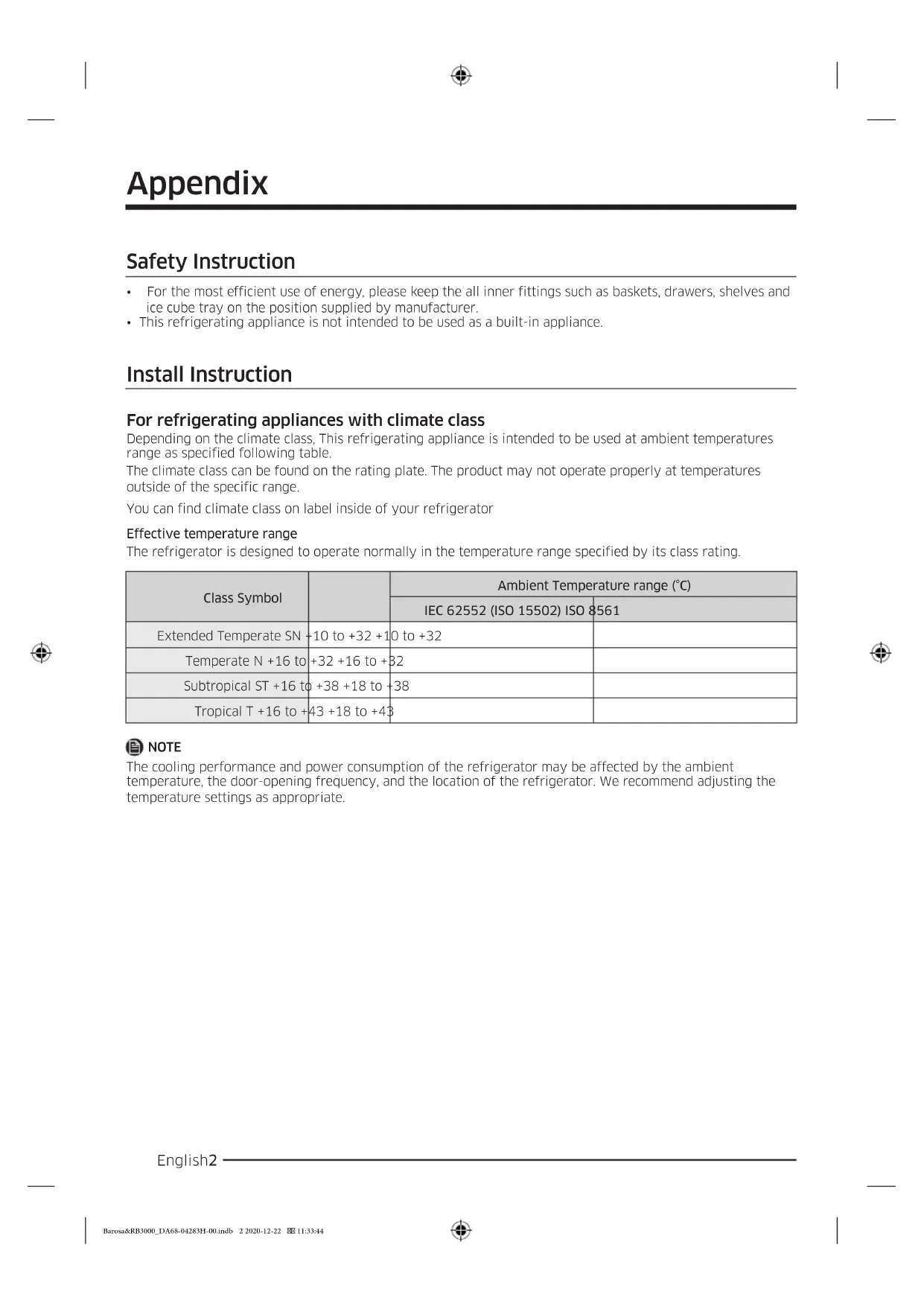 Extended Temperate SN +10 to +32 +10 to +32 Temperate N +16 to +32 +16 to +32 Subtropical ST +16 to +38 +18 to +38 Tropical T +16 to +43 +18 to +43 NOTE The cooling performance and power consumption of the refrigerator may be affected by the ambient temperature, the door-opening frequency, and the location of the refrigerator. We recommend adjusting the temperature settings as appropriate. Barosa&RB3000_DA68-04283H-00.indb 2 2020-12-22 11:33:44English 3 Temperature Instruction Recommended Temperature The optimal temperature setting for food storage: