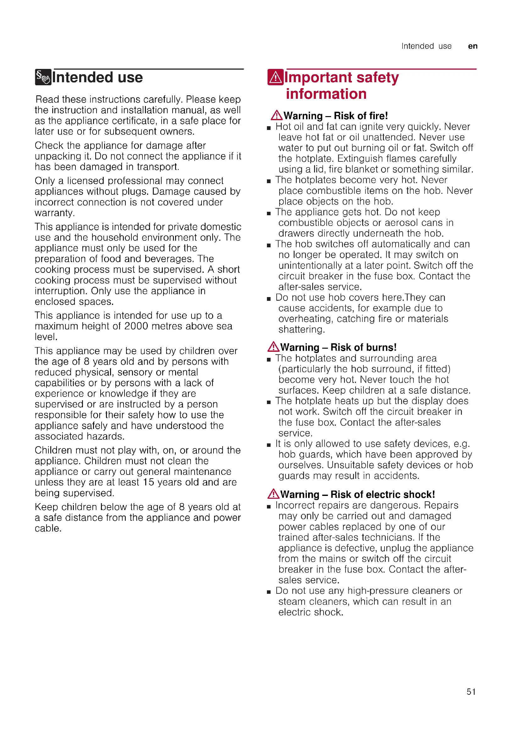 8Intended use Intended use Read these instructions carefully. Please keep the instruction and installation manual, as well as the appliance certificate, in a safe place for later use or for subsequent owners. Check the appliance for damage after unpacking it. Do not connect the appliance if it has been damaged in transport. Only a licensed professional may connect appliances without plugs. Damage caused by incorrect connection is not covered under warranty. This appliance is intended for private domestic use and the household environment only. The appliance must only be used for the preparation of food and beverages. The cooking process must be supervised. A short cooking process must be supervised without interruption. Only use the appliance in enclosed spaces. This appliance is intended for use up to a maximum height of 2000 metres above sea level. This appliance may be used by children over the age of 8 years old and by persons with reduced physical, sensory or mental capabilities or by persons with a lack of experience or knowledge if they are supervised or are instructed by a person responsible for their safety how to use the appliance safely and have understood the associated hazards. Children must not play with, on, or around the appliance. Children must not clean the appliance or carry out general maintenance unless they are at least 15 years old and are being supervised. Keep children below the age of 8 years old at a safe distance from the appliance and power cable. (Important safety information Impor t ant saf et y informat i on :Warning – Risk of fire! ■ Hot oil and fat can ignite very quickly. Never leave hot fat or oil unattended. Never use water to put out burning oil or fat. Switch off the hotplate. Extinguish flames carefully using a lid, fire blanket or something similar. Risk of fire! ■ The hotplates become very hot. Never place combustible items on the hob. Never place objects on the hob. Risk of fire! ■ The appliance gets hot. Do not keep combustible objects or aerosol cans in drawers directly underneath the hob. Risk of fire! ■ The hob switches off automatically and can no longer be operated. It may switch on unintentionally at a later point. Switch off the circuit breaker in the fuse box. Contact the after-sales service. Risk of burns! ■ Do not use hob covers here.They can cause accidents, for example due to overheating, catching fire or materials shattering. :Warning – Risk of burns! ■ The hotplates and surrounding area (particularly the hob surround, if fitted) become very hot. Never touch the hot surfaces. Keep children at a safe distance. Risk of burns! ■ The hotplate heats up but the display does not work. Switch off the circuit breaker in the fuse box. Contact the after-sales service. Risk of burns! ■ It is only allowed to use safety devices, e.g. hob guards, which have been approved by ourselves. Unsuitable safety devices or hob guards may result in accidents. :Warning – Risk of electric shock! ■ Incorrect repairs are dangerous. Repairs may only be carried out and damaged power cables replaced by one of our trained after-sales technicians. If the appliance is defective, unplug the appliance from the mains or switch off the circuit breaker in the fuse box. Contact the after- sales service. Risk of electric shock! ■ Do not use any high-pressure cleaners or steam cleaners, which can result in an electric shock. Risk of electric shock!en Causes of damage