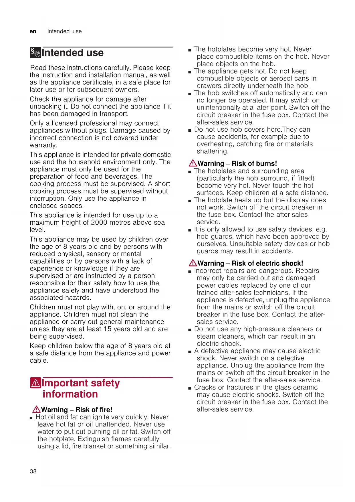 8Intended use Intended use Read these instructions carefully. Please keep the instruction and installation manual, as well as the appliance certificate, in a safe place for later use or for subsequent owners. Check the appliance for damage after unpacking it. Do not connect the appliance if it has been damaged in transport. Only a licensed professional may connect appliances without plugs. Damage caused by incorrect connection is not covered under warranty. This appliance is intended for private domestic use and the household environment only. The appliance must only be used for the preparation of food and beverages. The cooking process must be supervised. A short cooking process must be supervised without interruption. Only use the appliance in enclosed spaces. This appliance is intended for use up to a maximum height of 2000 metres above sea level. This appliance may be used by children over the age of 8 years old and by persons with reduced physical, sensory or mental capabilities or by persons with a lack of experience or knowledge if they are supervised or are instructed by a person responsible for their safety how to use the appliance safely and have understood the associated hazards. Children must not play with, on, or around the appliance. Children must not clean the appliance or carry out general maintenance unless they are at least 15 years old and are being supervised. Keep children below the age of 8 years old at a safe distance from the appliance and power cable. (Important safety information Impor t ant saf et y informat i on :Warning – Risk of fire! ■ Hot oil and fat can ignite very quickly. Never leave hot fat or oil unattended. Never use water to put out burning oil or fat. Switch off the hotplate. Extinguish flames carefully using a lid, fire blanket or something similar. Risk of fire! ■ The hotplates become very hot. Never place combustible items on the hob. Never place objects on the hob. Risk of fire! ■ The appliance gets hot. Do not keep combustible objects or aerosol cans in drawers directly underneath the hob. Risk of fire! ■ The hob switches off automatically and can no longer be operated. It may switch on unintentionally at a later point. Switch off the circuit breaker in the fuse box. Contact the after-sales service. Risk of burns! ■ Do not use hob covers here.They can cause accidents, for example due to overheating, catching fire or materials shattering. :Warning – Risk of burns! ■ The hotplates and surrounding area (particularly the hob surround, if fitted) become very hot. Never touch the hot surfaces. Keep children at a safe distance. Risk of burns! ■ The hotplate heats up but the display does not work. Switch off the circuit breaker in the fuse box. Contact the after-sales service. Risk of burns! ■ It is only allowed to use safety devices, e.g. hob guards, which have been approved by ourselves. Unsuitable safety devices or hob guards may result in accidents. :Warning – Risk of electric shock! ■ Incorrect repairs are dangerous. Repairs may only be carried out and damaged power cables replaced by one of our trained after-sales technicians. If the appliance is defective, unplug the appliance from the mains or switch off the circuit breaker in the fuse box. Contact the after- sales service. Risk of electric shock! ■ Do not use any high-pressure cleaners or steam cleaners, which can result in an electric shock. Risk of electric shock! ■ A defective appliance may cause electric shock. Never switch on a defective appliance. Unplug the appliance from the mains or switch off the circuit breaker in the fuse box. Contact the after-sales service. Risk of electric shock! ■ Cracks or fractures in the glass ceramic may cause electric shocks. Switch off the circuit breaker in the fuse box. Contact the after-sales service.Causes of damage en