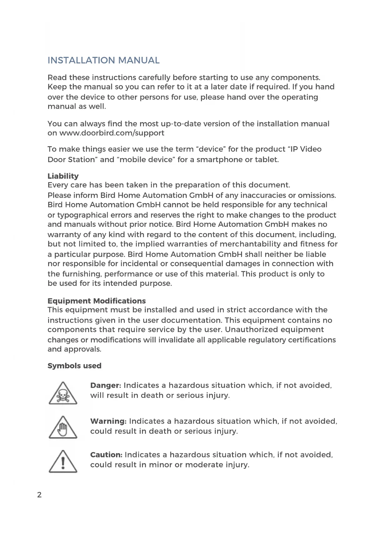 Page 1-19 Installation Manual IP Video Door Station D10x Series Seite 20-39 Installationsanleitung IP Video Türstation D10x Serie Page 40-58 Manuel d´installation Interphone vidéo IP Série D10x D10X2 INSTALLATION MANUAL Read these instructions carefully before starting to use any components. Keep the manual so you can refer to it at a later date if required. If you hand over the device to other persons for use, please hand over the operating manual as well. You can always find the most up-to-date version of the installation manual on www.doorbird.com/support To make things easier we use the term “device” for the product “IP Video Door Station” and “mobile device” for a smartphone or tablet. Liability Every care has been taken in the preparation of this document. Please inform Bird Home Automation GmbH of any inaccuracies or omissions. Bird Home Automation GmbH cannot be held responsible for any technical or typographical errors and reserves the right to make changes to the product and manuals without prior notice. Bird Home Automation GmbH makes no warranty of any kind with regard to the content of this document, including, but not limited to, the implied warranties of merchantability and fitness for a particular purpose. Bird Home Automation GmbH shall neither be liable nor responsible for incidental or consequential damages in connection with the furnishing, performance or use of this material. This product is only to be used for its intended purpose. Equipment Modifications This equipment must be installed and used in strict accordance with the instructions given in the user documentation. This equipment contains no components that require service by the user. Unauthorized equipment changes or modifications will invalidate all applicable regulatory certifications and approvals. Symbols used Caution: Indicates a hazardous situation which, if not avoided, could result in minor or moderate injury.