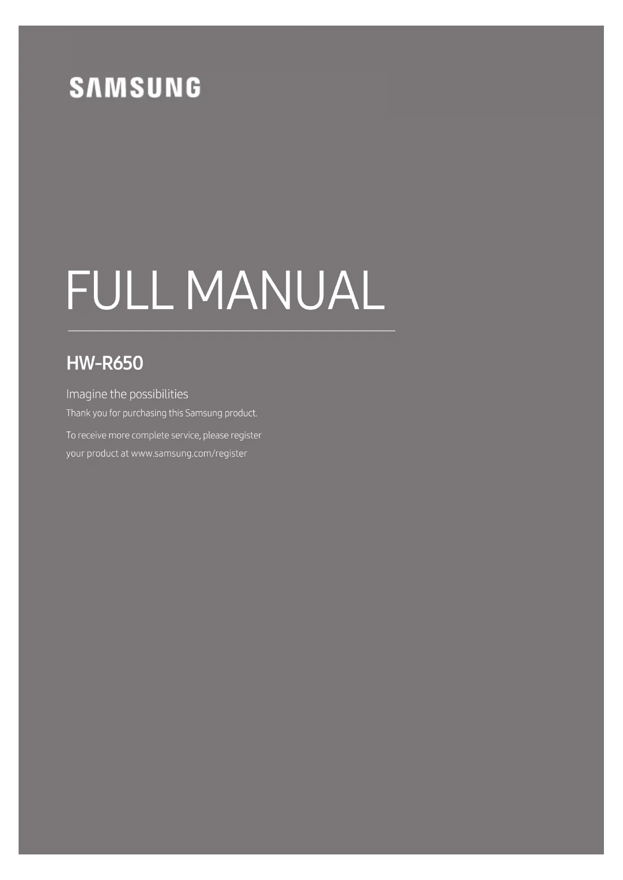 FULL MANUAL Imagine the possibilities Thank you for purchasing this Samsung product. To receive more complete service, please register your product at www.samsung.com/register HW-R650ENG - ii SAFETY INFORMATION SAFETY WARNINGS TO REDUCE THE RISK OF ELECTRIC SHOCK, DO NOT REMOVE THE COVER (OR BACK). NO USER-SERVICEABLE PARTS ARE INSIDE.
