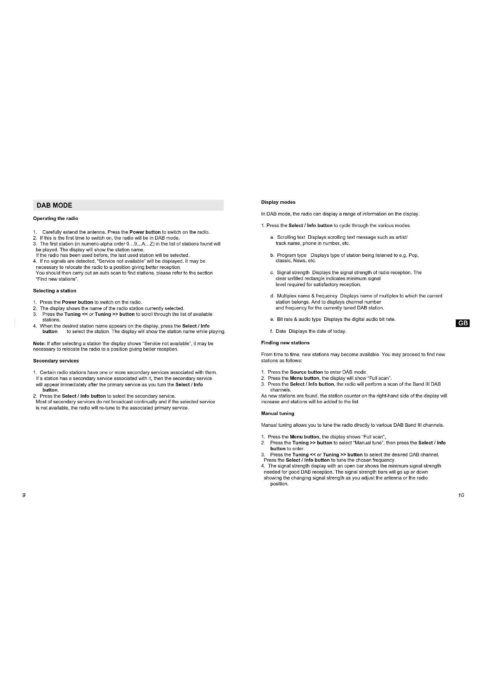 Most of secondary services do not broadcast continually and if the selected service is not available, the radio will re-tune to the associated primary service. Display modes In DAB mode, the radio can display a range of information on the display.