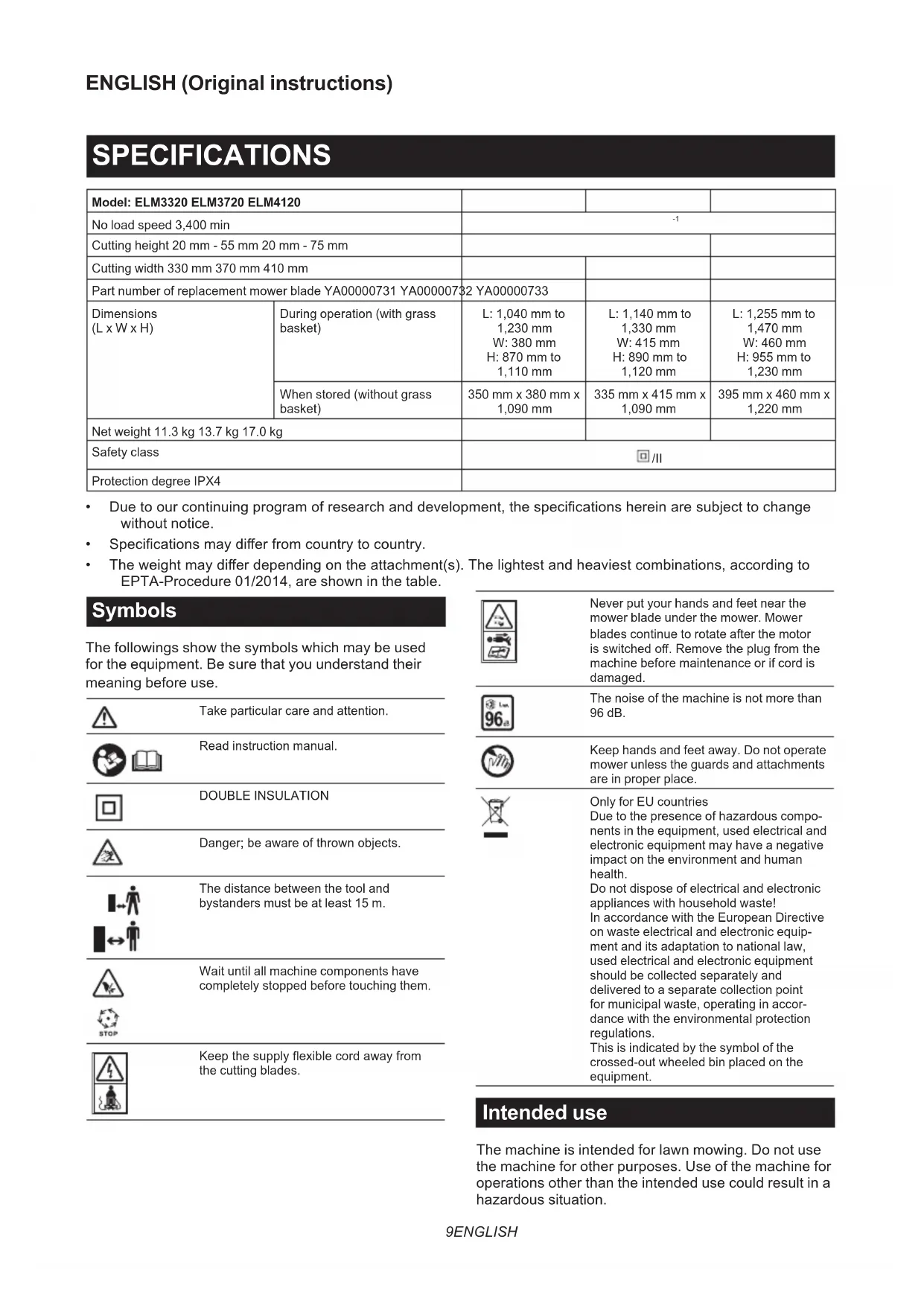 - Theweightmaydierdependingontheattachment(s).Thelightestandheaviestcombinations,accordingto EPTA-Procedure 01/2014, are shown in the table. Symbols The followings show the symbols which may be used for the equipment. Be sure that you understand their meaning before use. Take particular care and attention. Read instruction manual. DOUBLE INSULATION Danger;beawareofthrownobjects. The distance between the tool and bystanders must be at least 15 m. Wait until all machine components have completely stopped before touching them. Keepthesupplyexiblecordawayfrom the cutting blades. Never put your hands and feet near the mower blade under the mower. Mower blades continue to rotate after the motor isswitchedo.Removetheplugfromthe machine before maintenance or if cord is damaged. The noise of the machine is not more than 96 dB. Keep hands and feet away. Do not operate mower unless the guards and attachments are in proper place. Only for EU countries Due to the presence of hazardous compo- nents in the equipment, used electrical and electronic equipment may have a negative impact on the environment and human health. Do not dispose of electrical and electronic appliances with household waste! In accordance with the European Directive on waste electrical and electronic equip- ment and its adaptation to national law, used electrical and electronic equipment should be collected separately and delivered to a separate collection point for municipal waste, operating in accor- dance with the environmental protection regulations. This is indicated by the symbol of the crossed-out wheeled bin placed on the equipment. Intended use The machine is intended for lawn mowing. Do not use the machine for other purposes. Use of the machine for operations other than the intended use could result in a hazardous situation.10 ENGLISH Power supply The tool should be connected only to a power supply of the same voltage as indicated on the nameplate, and can only be operated on single-phase AC supply. They are double-insulated and can, therefore, also be used from sockets without earth wire. If the supply cord is damaged, it must be replaced by the manufacturer or its service agent in order to avoid a hazard. For public low-voltage distribution systems of between 220 V and 250 V Switching operations of electric apparatus cause voltageuctuations.Theoperationofthisdevice under unfavorable mains conditions can have adverse eectstotheoperationofotherequipment.Witha mains impedance equal or less than 0.425 Ohms (for ELM3720) or 0.427 Ohms (for ELM4120), it can be pre- sumedthattherewillbenonegativeeects.Themains socket used for this device must be protected with a fuse or protective circuit breaker having slow tripping characteristics. Noise Applicable standard : EN IEC 62841-4-3 Model Sound pressure level Sound power level