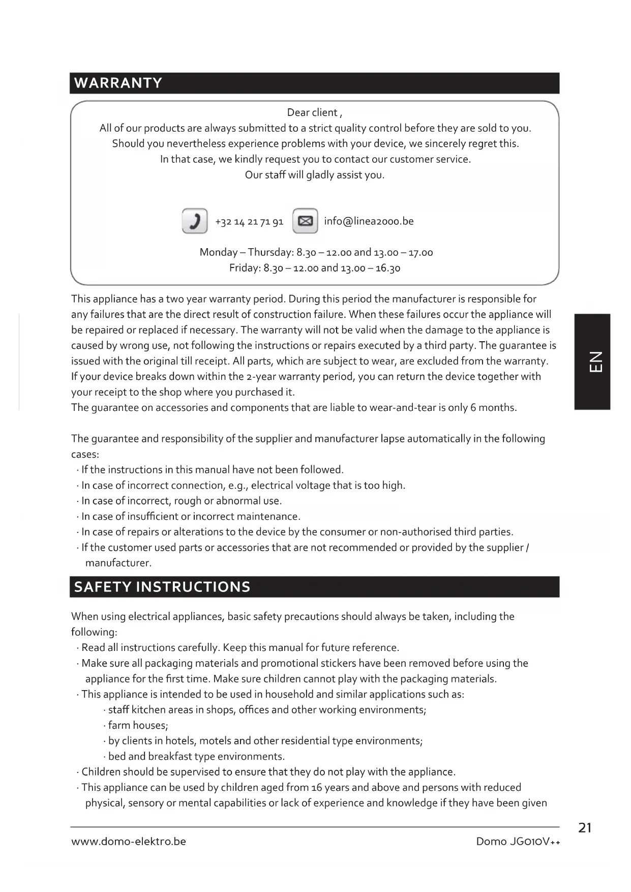 WARRANTY Dear client , All of our products are always submitted to a strict quality control before they are sold to you. Should you nevertheless experience problems with your device, we sincerely regret this. In that case, we kindly request you to contact our customer service. Our sta will gladly assist you. +32 14 21 71 91 info@linea2000.be Monday – Thursday: 8.30 – 12.00 and 13.00 – 17.00 Friday: 8.30 – 12.00 and 13.00 – 16.30 This appliance has a two year warranty period. During this period the manufacturer is responsible for any failures that are the direct result of construction failure. When these failures occur the appliance will be repaired or replaced if necessary. The warranty will not be valid when the damage to the appliance is caused by wrong use, not following the instructions or repairs executed by a third party. The guarantee is issued with the original till receipt. All parts, which are subject to wear, are excluded from the warranty. If your device breaks down within the 2-year warranty period, you can return the device together with your receipt to the shop where you purchased it. The guarantee on accessories and components that are liable to wear-and-tear is only 6 months. The guarantee and responsibility of the supplier and manufacturer lapse automatically in the following cases: