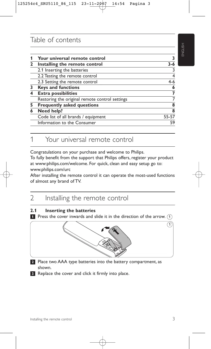 Need help? If you have any questions about the SRU 5110, you can always contact us. You will find our contact details after the code list at the back of this manual. Read this manual carefully before you make a call. You can solve most of the problems yourself. If you cannot find any answers to your problems, write down the details of your device in the code list at the back of this manual. This will help our operators to assist you better and more quickly. Look up the numbers of the models in the instructions accompanying the device or on the back of your device.When you call our helpline, make sure the device is to hand so that our operators can help you determine whether your remote control is working properly. The model number of your Philips universal remote control is SRU 5110/86. Date of purchase: