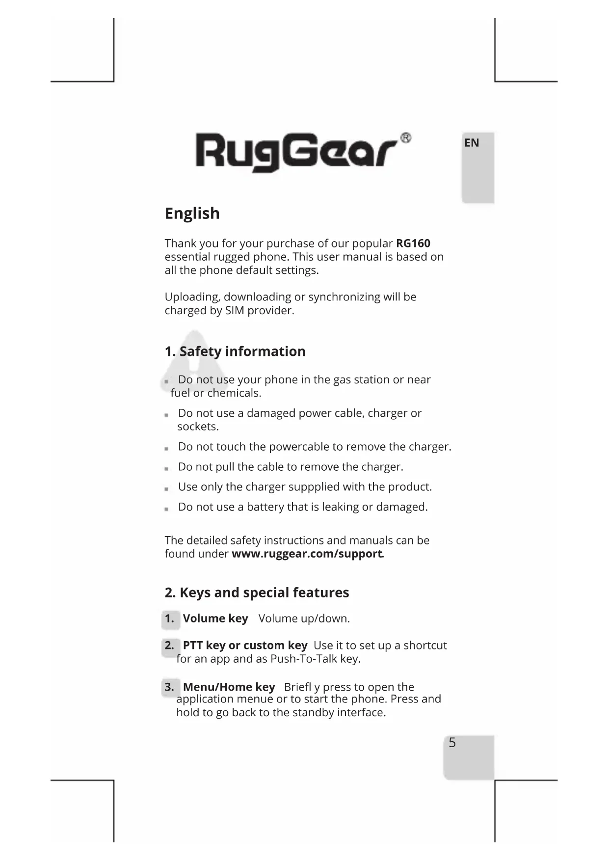 USB CHARGINGEnglish Thank you for your purchase of our popular RG160 essential rugged phone. This user manual is based on all the phone default settings. Uploading, downloading or synchronizing will be charged by SIM provider.