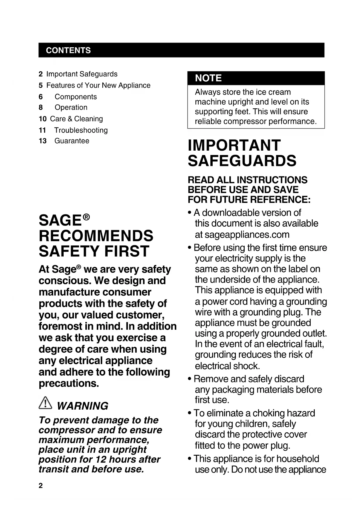 GUARANTEE Sage Appliances guarantees this product for domestic use in specied territories for 2 years for all parts of the product and 5 years for the product’s motor from the date of purchase against defects caused by faulty workmanship and materials. During this guarantee period Sage Appliances will repair, replace, or refund any defective product (at the sole discretion of Sage Appliances). All legal warranty rights under applicable national legislation will be respected and will not be impaired by our guarantee. For full terms and conditions on the guarantee, as well as instructions on how to make a claim, please visit www.sageappliances.com.14 INHALTE HINWEIS Eismaschine immer auf einer ebenen Fläche aufrecht auf den Füßchen stehend lagern, um zuverlässige Leistung des Kompressors zu gewährleisten. WICHTIGE VORSICHTS- MASSNAHMEN