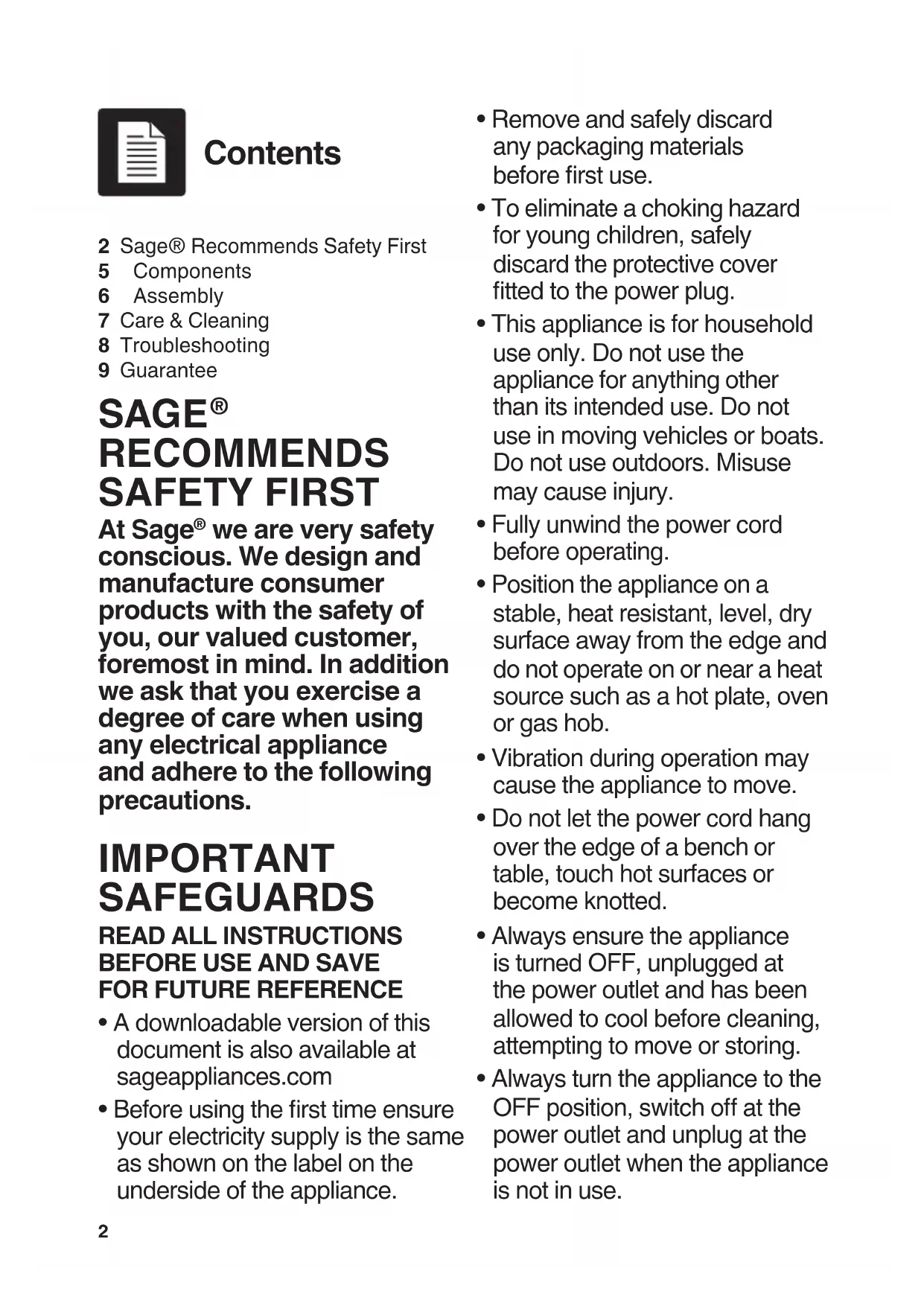 - Before using the rst time ensure your electricity supply is the same as shown on the label on the underside of the appliance. 2 Sage® Recommends Safety First 5 Components6 Assembly7 Care & Cleaning8 Troubleshooting9 Guarantee3