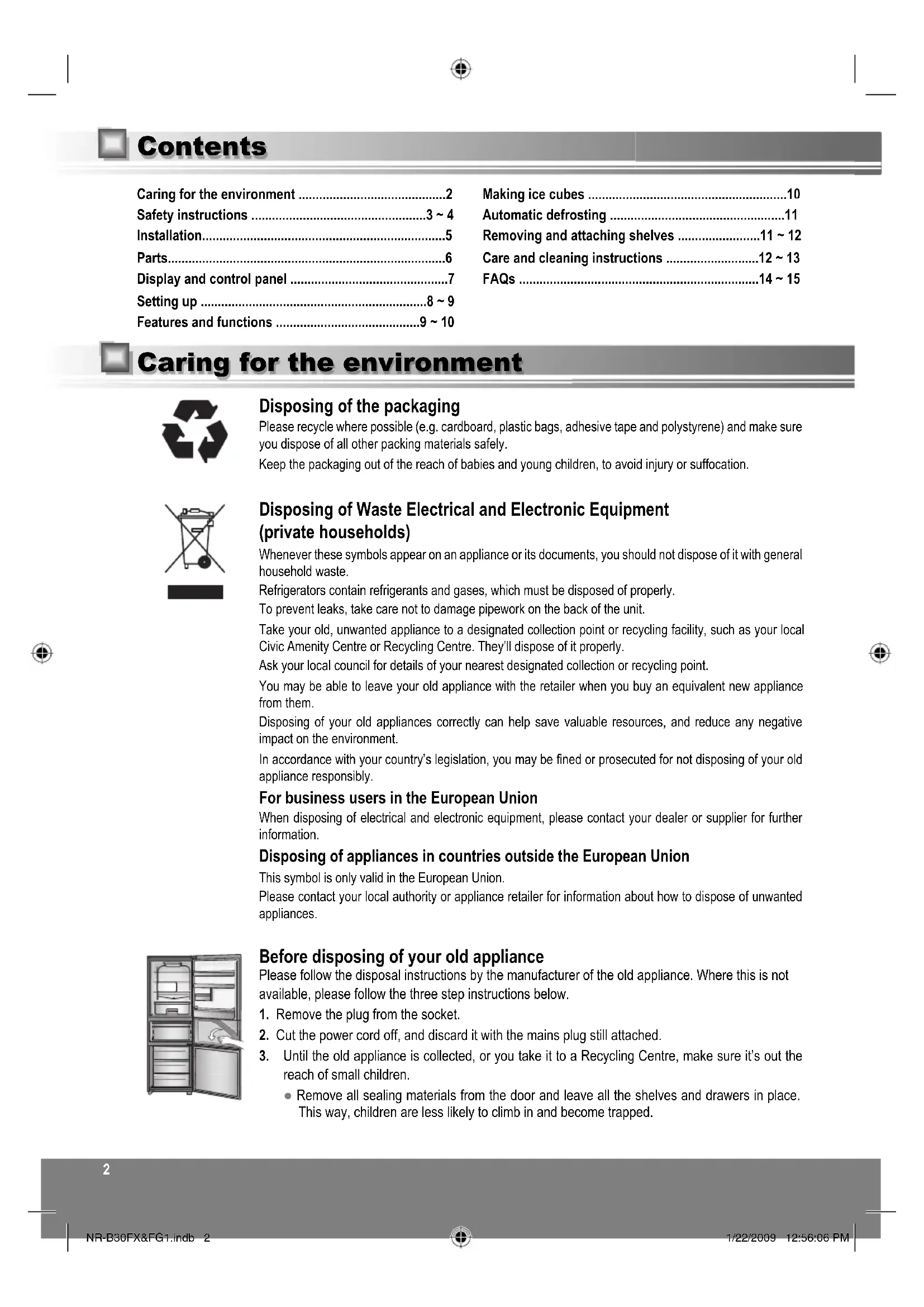 - ~ 13 FAQs ~ 15 Contents Disposing of the packaging Please recycle where possible (e.g. cardboard, plastic bags, adhesive tape and polystyrene) and make sure you dispose of all other packing materials safely. Keep the packaging out of the reach of babies and young children, to avoid injury or suffocation. Disposing of Waste Electrical and Electronic Equipment (private households) Whenever these symbols appear on an appliance or its documents, you should not dispose of it with general household waste. Refrigerators contain refrigerants and gases, which must be disposed of properly. To prevent leaks, take care not to damage pipework on the back of the unit. Take your old, unwanted appliance to a designated collection point or recycling facility, such as your local Civic Amenity Centre or Recycling Centre. They’ll dispose of it properly. Ask your local council for details of your nearest designated collection or recycling point. You may be able to leave your old appliance with the retailer when you buy an equivalent new appliance from them. Disposing of your old appliances correctly can help save valuable resources, and reduce any negative impact on the environment. In accordance with your country’s legislation, you may be fined or prosecuted for not disposing of your old appliance responsibly. For business users in the European Union When disposing of electrical and electronic equipment, please contact your dealer or supplier for further information. Disposing of appliances in countries outside the European Union This symbol is only valid in the European Union. Please contact your local authority or appliance retailer for information about how to dispose of unwanted appliances. Before disposing of your old appliance Please follow the disposal instructions by the manufacturer of the old appliance. Where this is not available, please follow the three step instructions below. p. 14