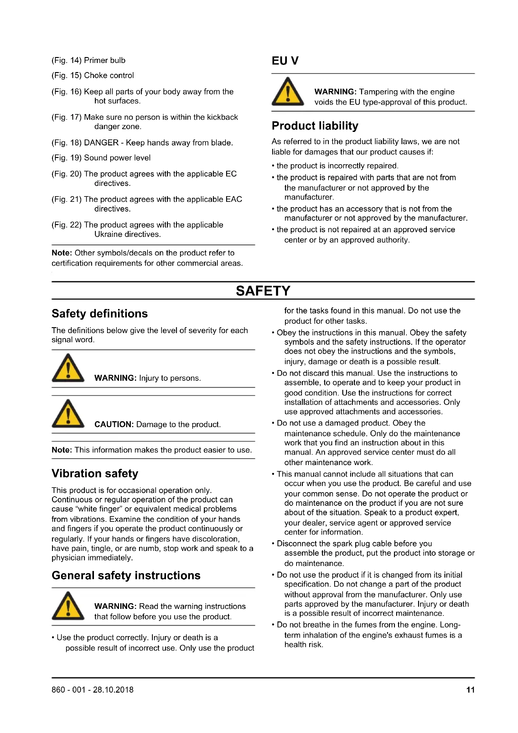 Symbols on the product (Fig. 2) Warning (Fig. 3) Read this manual (Fig. 4) Wear approved head protection, hearing protection and eye protection. (Fig. 5) Wear approved protective gloves. (Fig. 6) Use heavy-duty slip-resistant boots. (Fig. 7) The product can cause objects to eject, which can cause injury. (Fig. 8) Maximum speed of the output shaft. (Fig. 9) Safe distance (Fig. 10) Safe distance (Fig. 11) Risk of blade thrust if the cutting equipment touches an object that it does not immediately cut. The product can cut off body parts. Keep a minimum of 15 m (50 ft) distance to persons and animals during operation of the product. (Fig. 12) Make sure that long hair is put up above your shoulders. (Fig. 13) The arrows show the limits for the position of the handle. 10 860 - 001 - 28.10.2018(Fig. 14) Primer bulb (Fig. 15) Choke control (Fig. 16) Keep all parts of your body away from the hot surfaces. (Fig. 17) Make sure no person is within the kickback danger zone. (Fig. 18) DANGER - Keep hands away from blade. (Fig. 19) Sound power level (Fig. 20) The product agrees with the applicable EC directives. (Fig. 21) The product agrees with the applicable EAC directives. (Fig. 22) The product agrees with the applicable Ukraine directives. Note: Other symbols/decals on the product refer to certification requirements for other commercial areas. EU V