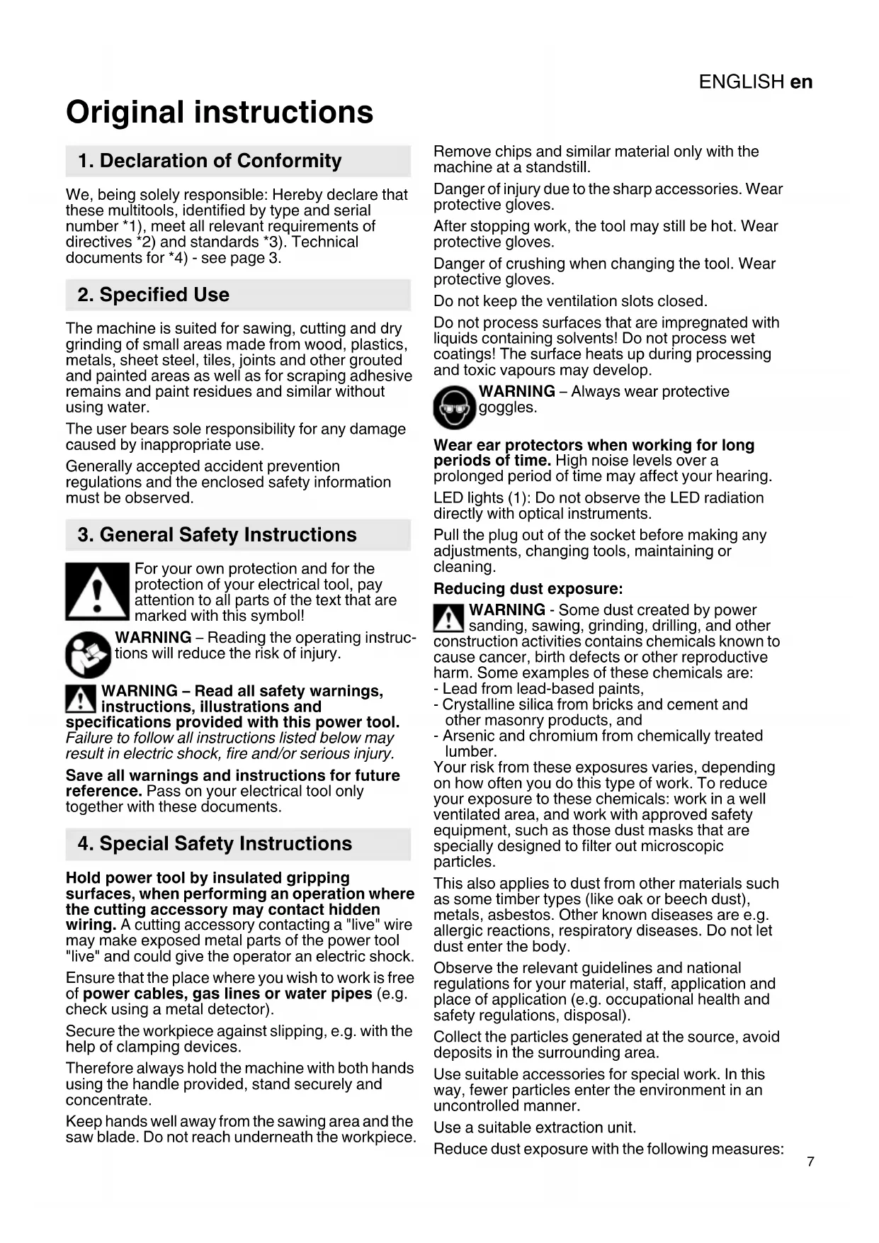 Original instructions We, being solely responsible: Hereby declare that these multitools, identified by type and serial number *1), meet all relevant requirements of directives *2) and standards *3). Technical documents for *4) - see page 3. The machine is suited for sawing, cutting and dry grinding of small areas made from wood, plastics, metals, sheet steel, tiles, joints and other grouted and painted areas as well as for scraping adhesive remains and paint residues and similar without using water. The user bears sole responsibility for any damage caused by inappropriate use. Generally accepted accident prevention regulations and the enclosed safety information must be observed. For your own protection and for the protection of your electrical tool, pay attention to all parts of the text that are marked with this symbol! WARNING – Reading the operating instruc- tions will reduce the risk of injury. WARNING – Read all safety warnings, instructions, illustrations and specifications provided with this power tool. Failure to follow all instructions listed below may result in electric shock, fire and/or serious injury. Save all warnings and instructions for future reference. Pass on your electrical tool only together with these documents. Hold power tool by insulated gripping surfaces, when performing an operation where the cutting accessory may contact hidden wiring. A cutting accessory contacting a "live" wire may make exposed metal parts of the power tool "live" and could give the operator an electric shock. Ensure that the place where you wish to work is free of power cables, gas lines or water pipes (e.g. check using a metal detector). Secure the workpiece against slipping, e.g. with the help of clamping devices. Therefore always hold the machine with both hands using the handle provided, stand securely and concentrate. Keep hands well away from the sawing area and the saw blade. Do not reach underneath the workpiece. Remove chips and similar material only with the machine at a standstill. Danger of injury due to the sharp accessories. Wear protective gloves. After stopping work, the tool may still be hot. Wear protective gloves. Danger of crushing when changing the tool. Wear protective gloves. Do not keep the ventilation slots closed. Do not process surfaces that are impregnated with liquids containing solvents! Do not process wet coatings! The surface heats up during processing and toxic vapours may develop. WARNING – Always wear protective goggles. Wear ear protectors when working for long periods of time. High noise levels over a prolonged period of time may affect your hearing. LED lights (1): Do not observe the LED radiation directly with optical instruments. Pull the plug out of the socket before making any adjustments, changing tools, maintaining or cleaning. Reducing dust exposure: WARNING - Some dust created by power sanding, sawing, grinding, drilling, and other construction activities contains chemicals known to cause cancer, birth defects or other reproductive harm. Some examples of these chemicals are: - Lead from lead-based paints, - Crystalline silica from bricks and cement and other masonry products, and - Arsenic and chromium from chemically treated lumber. Your risk from these exposures varies, depending on how often you do this type of work. To reduce your exposure to these chemicals: work in a well ventilated area, and work with approved safety equipment, such as those dust masks that are specially designed to filter out microscopic particles. This also applies to dust from other materials such as some timber types (like oak or beech dust), metals, asbestos. Other known diseases are e.g. allergic reactions, respiratory diseases. Do not let dust enter the body. Observe the relevant guidelines and national regulations for your material, staff, application and place of application (e.g. occupational health and safety regulations, disposal). Collect the particles generated at the source, avoid deposits in the surrounding area. Use suitable accessories for special work. In this way, fewer particles enter the environment in an uncontrolled manner. Use a suitable extraction unit. Reduce dust exposure with the following measures: