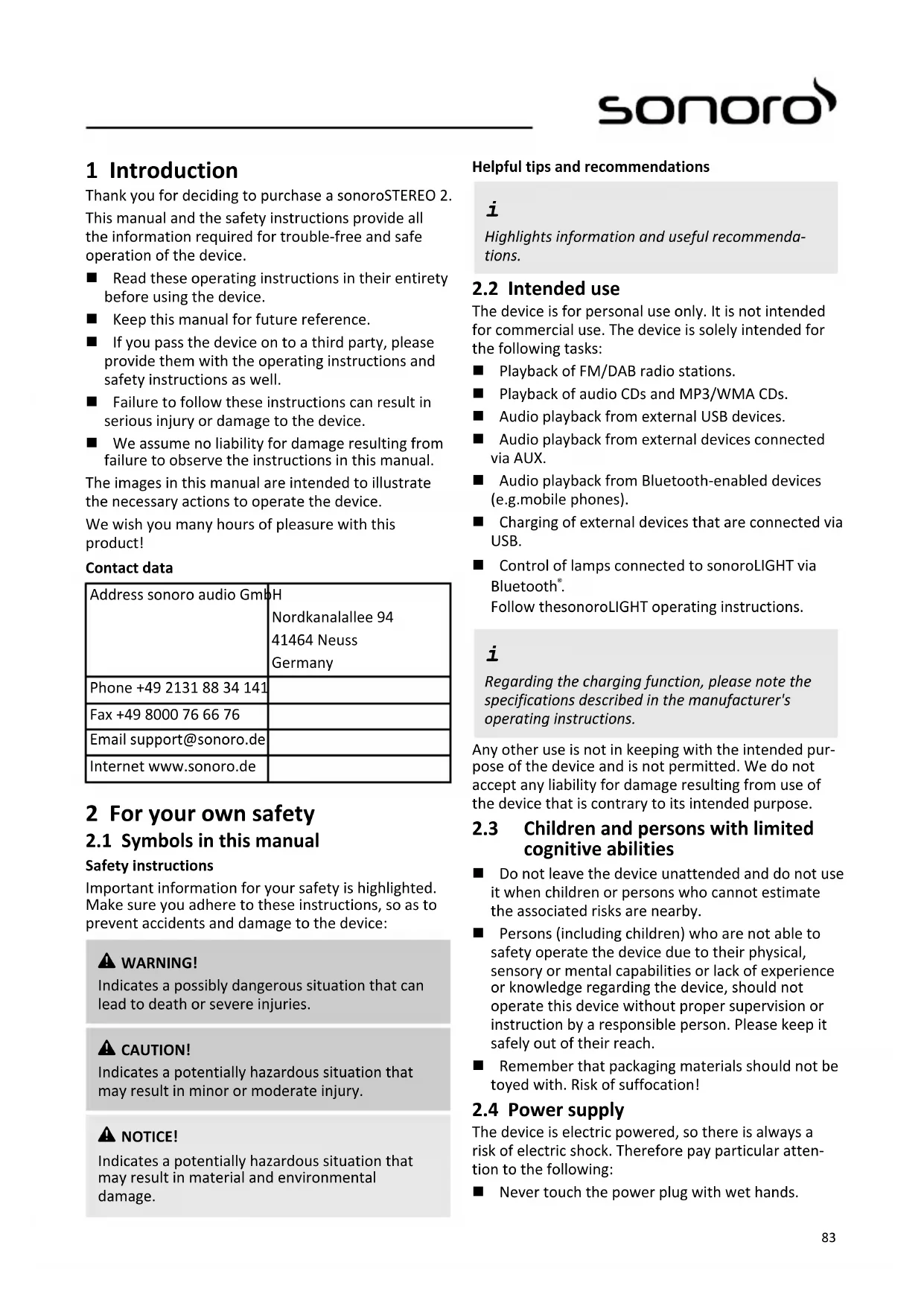 Thank you for deciding to purchase a sonoroSTEREO 2. This manual and the safety instructions provide all the information required for trouble-free and safe operation of the device.