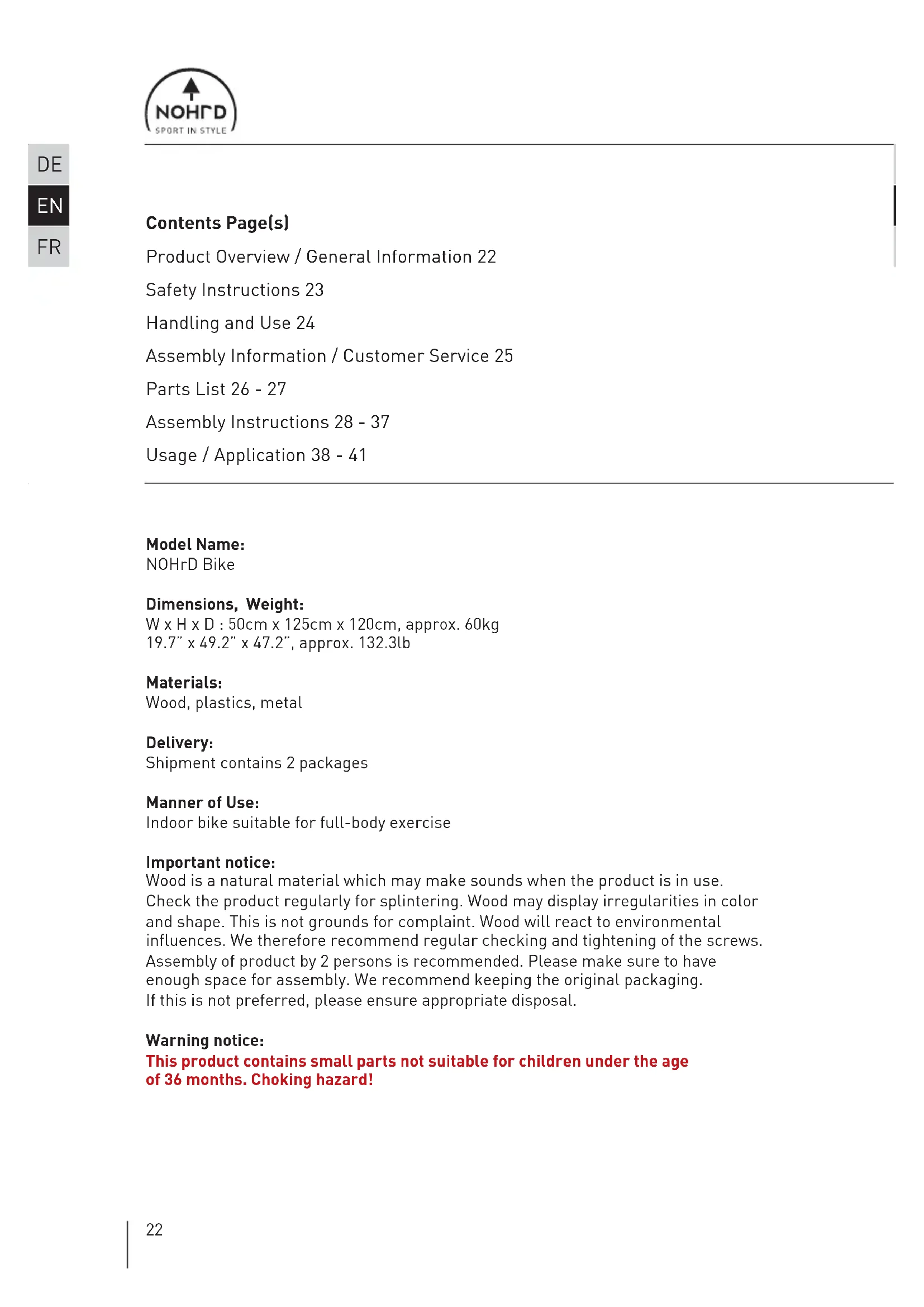 Contents Page(s) Product Overview / General Information 22 Safety Instructions 23 Handling and Use 24 Assembly Information / Customer Service 25 Parts List 26 - 27 Assembly Instructions 28 - 37 Usage / Application 38 - 41 Model Name: NOHrD Bike Dimensions, Weight: W x H x D : 50cm x 125cm x 120cm, approx. 60kg 19.7” x 49.2” x 47.2”, approx. 132.3lb Materials: Wood, plastics, metal Delivery: Shipment contains 2 packages Manner of Use: Indoor bike suitable for full-body exercise Important notice: Wood is a natural material which may make sounds when the product is in use. Check the product regularly for splintering. Wood may display irregularities in color and shape. This is not grounds for complaint. Wood will react to environmental influences. We therefore recommend regular checking and tightening of the screws. Assembly of product by 2 persons is recommended. Please make sure to have enough space for assembly. We recommend keeping the original packaging. If this is not preferred, please ensure appropriate disposal. Warning notice: This product contains small parts not suitable for children under the age of 36 months. Choking hazard!23 Service / Parts: www.nohrd.com Safety Instructions Please read the following instructions carefully regarding handling, use and care of your NOHrD Bike. It is advised to keep this instruction manual for future reference. Following the safety, assembly and operating instructions will help ensure safe and risk-free use of this product.