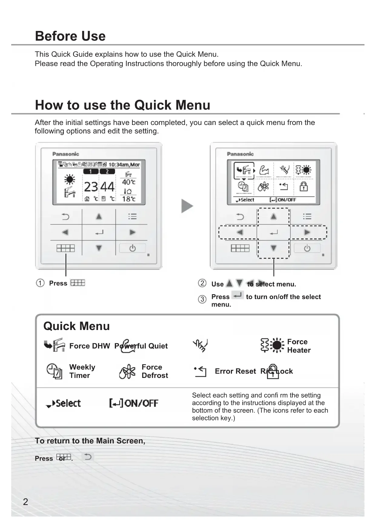 Use to select menu. Press to turn on/off the select menu. To return to the Main Screen, Press or .3 How to use the Quick Menu Notes on operation icon Example:• Operation icon indicate with “ ” = OFF• Operation icon indicate with “ ” = ON Select this icon to turn the Tank DHW on or off. Press to confi rm your selection.