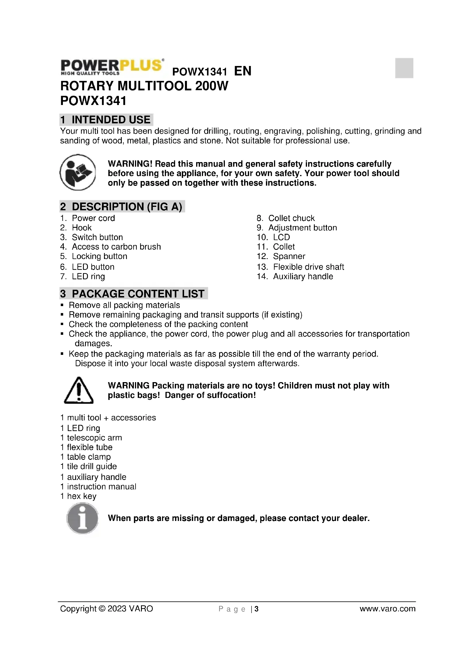 - Keep the packaging materials as far as possible till the end of the warranty period. Dispose it into your local waste disposal system afterwards. WARNING Packing materials are no toys! Children must not play with plastic bags! Danger of suffocation! 1 multi tool + accessories 1 LED ring 1 telescopic arm 1 flexible tube 1 table clamp 1 tile drill guide 1 auxiliary handle 1 instruction manual 1 hex key When parts are missing or damaged, please contact your dealer.POWX1341 EN Copyright © 2023 VARO P a g e | 4 www.varo.com 4 SYMBOLS In this manual and/or on the machine the following symbols are used: