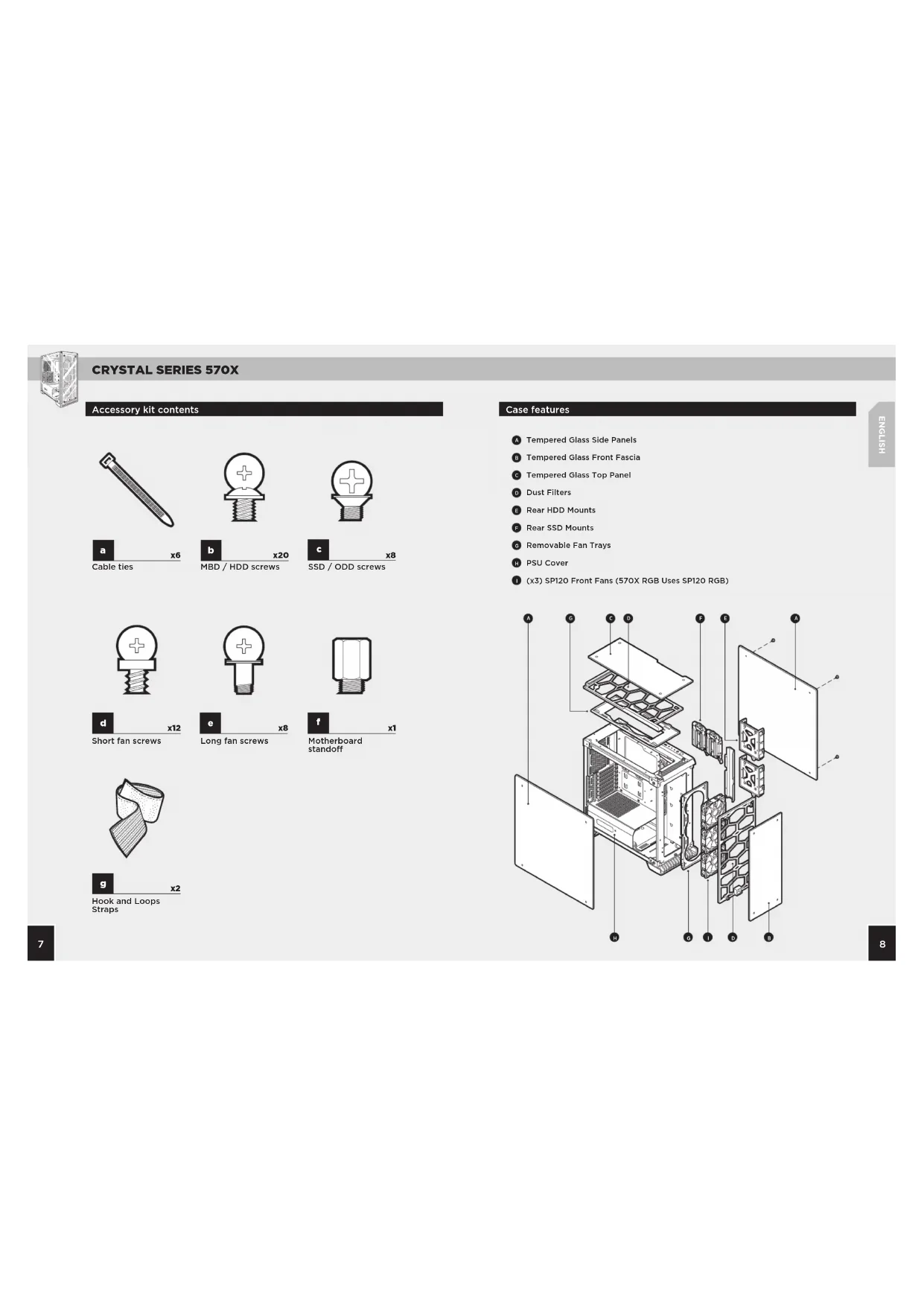 ENGLISH Case features Accessory kit contents Tempered Glass Side Panels Tempered Glass Front Fascia Tempered Glass Top Panel Dust Filters Rear HDD Mounts Rear SSD Mounts Removable Fan Trays PSU Cover (x3) SP120 Front Fans (570X RGB Uses SP120 RGB)