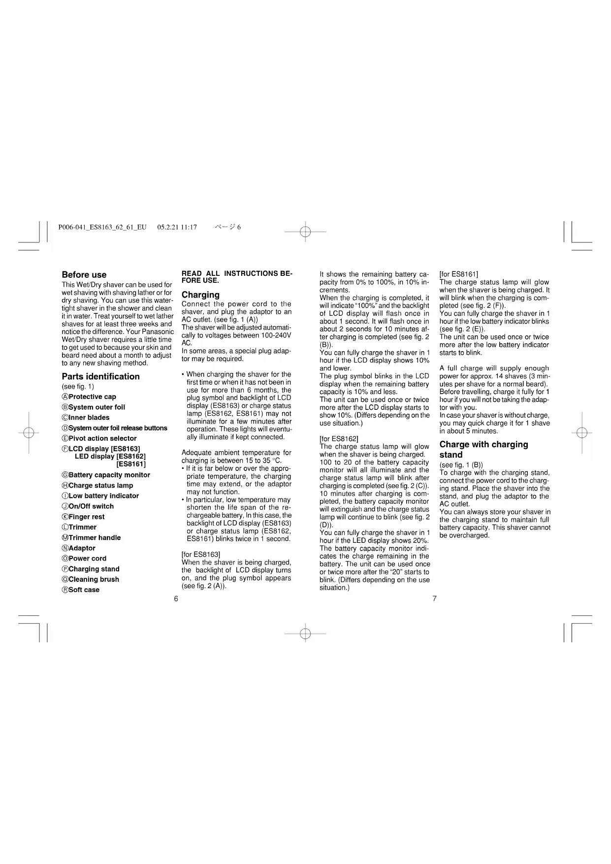 P000-005ES81636261EU 05.2.21 11:17 ページ47 Before use This Wet/Dry shaver can be used for wet shaving with shaving lather or for dry shaving. You can use this water- tight shaver in the shower and clean it in water. Treat yourself to wet lather shaves for at least three weeks and notice the difference. Your Panasonic Wet/Dry shaver requires a little time to get used to because your skin and beard need about a month to adjust to any new shaving method. Parts identification (see fig. 1) A Protective cap B System outer foil C Inner blades D System outer foil release buttons E Pivot action selector F LCD display [ES8163] LED display [ES8162] [ES8161] G Battery capacity monitor H Charge status lamp I Low battery indicator J On/Off switch K Finger rest L Trimmer M Trimmer handle N Adaptor O Power cord P Charging stand Q Cleaning brush R Soft case